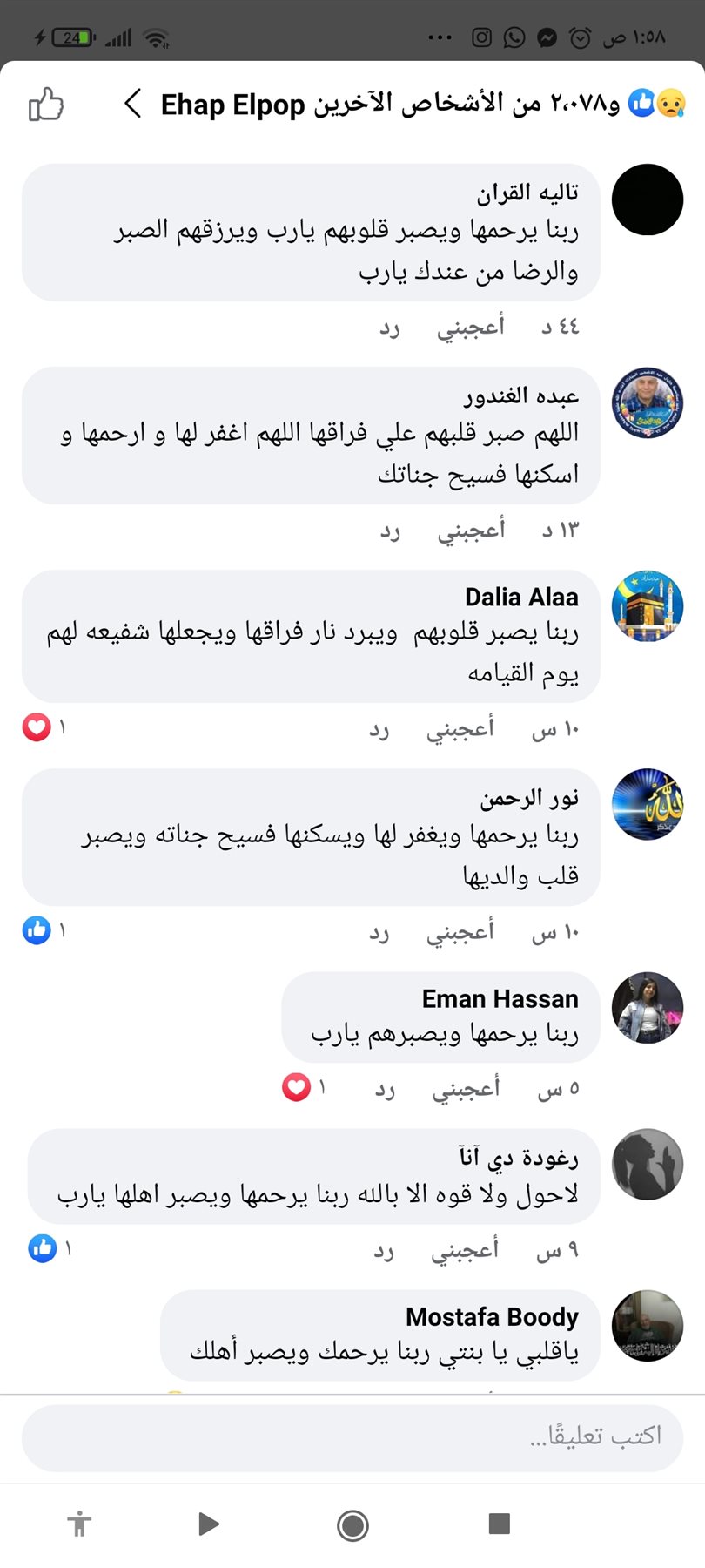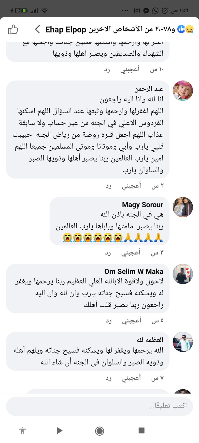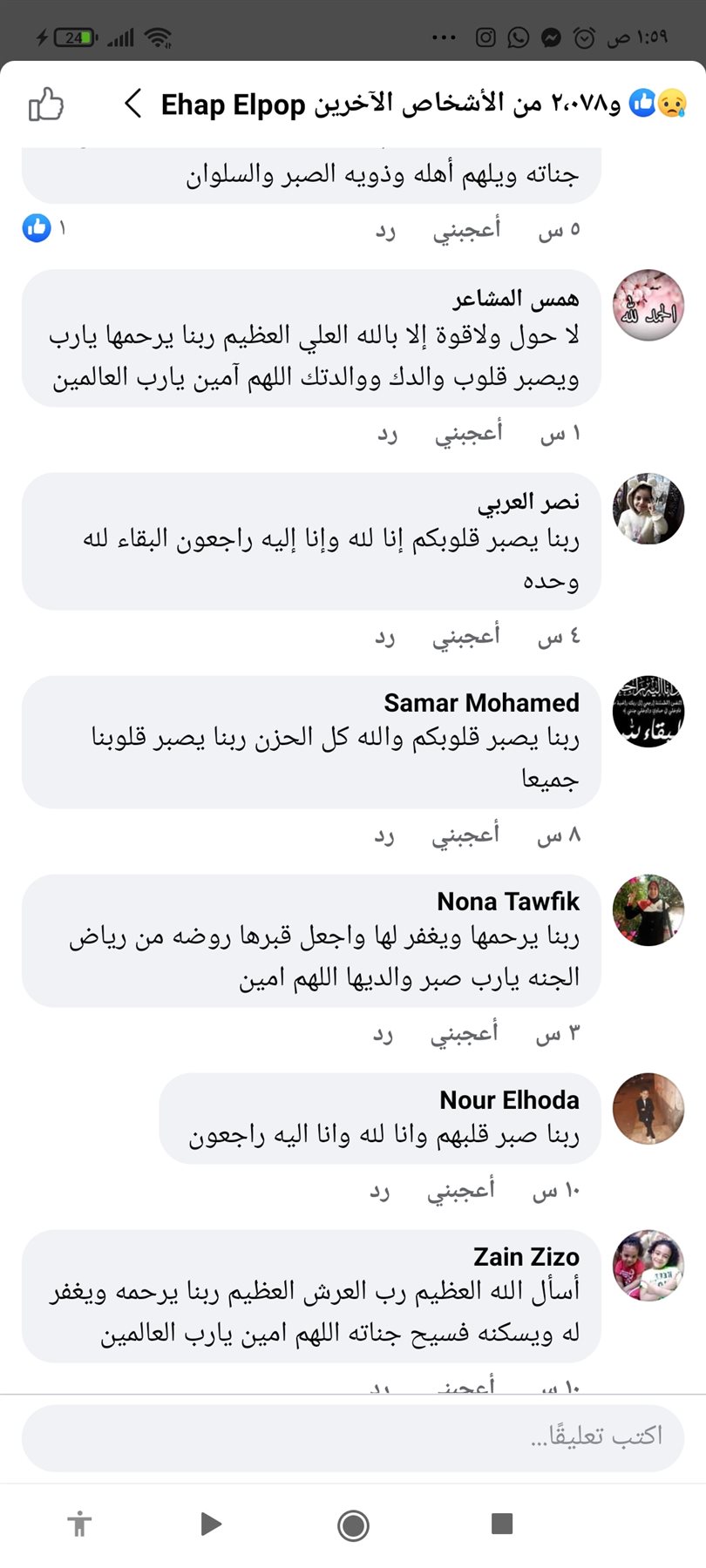 وتنوعت تعليقات المواطنين ما بين الصدمة من بشاعة الحادث المأساوي، وما بين الدعاء للطفلة الضحية بالرحمة، وما بين أيضًا الدعاء لأهلها أن يربط الله عز وجل على قلوبهم بالصبر.