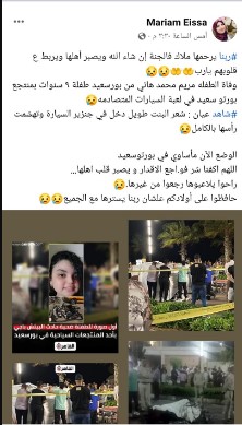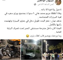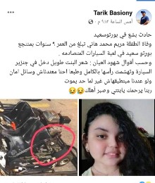 ما زال أهالي بورسعيد يعيشون حالة من الحزن المستمر جراء الحادث المأساوي الذي تعرضت له الطفلة مريم، وتسبب في تهشيم رأسها داخل موتور سيارة من السيارات المتصادمة بمنتجع ببورسعيد.
