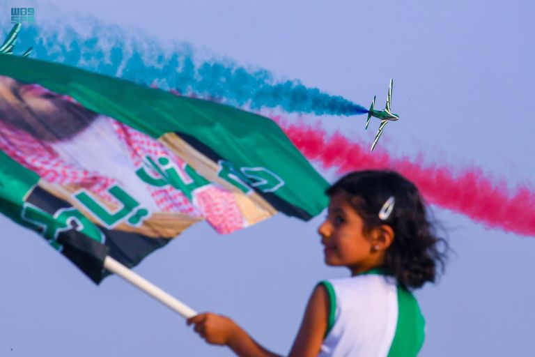 وقدمت القوات الجوية الملكية السعودية عروضًا جوية مهيبة بالطائرات المزينة بشعار اليوم الوطني، من طرازات "تايفون"، و"ف - 15 إس"، و"تورنيدو"، و"ف - 15 سي".