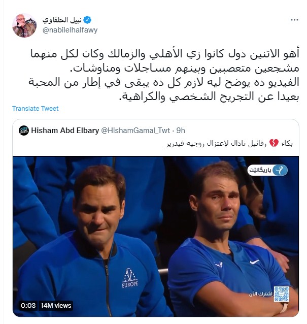 أثارت لقطة بكاء نجمي التنس رافائيل نادل وروجر فيدرير، حالة من الشجن لدى نشطاء مواقع التواصل الاجتماعي، وتفاعل معها الفنان نبيل الحلفاوي، مستشهدًا ببكاء نادل وفيدرير، بعد اعتزال روجر فيدرير؛ لينصح جمهور الأهلي والزمالك، بأن يكون تشجيعهما بعيدًا عن التجريح الشخصي والكراهية وفي إطار من المحبة.