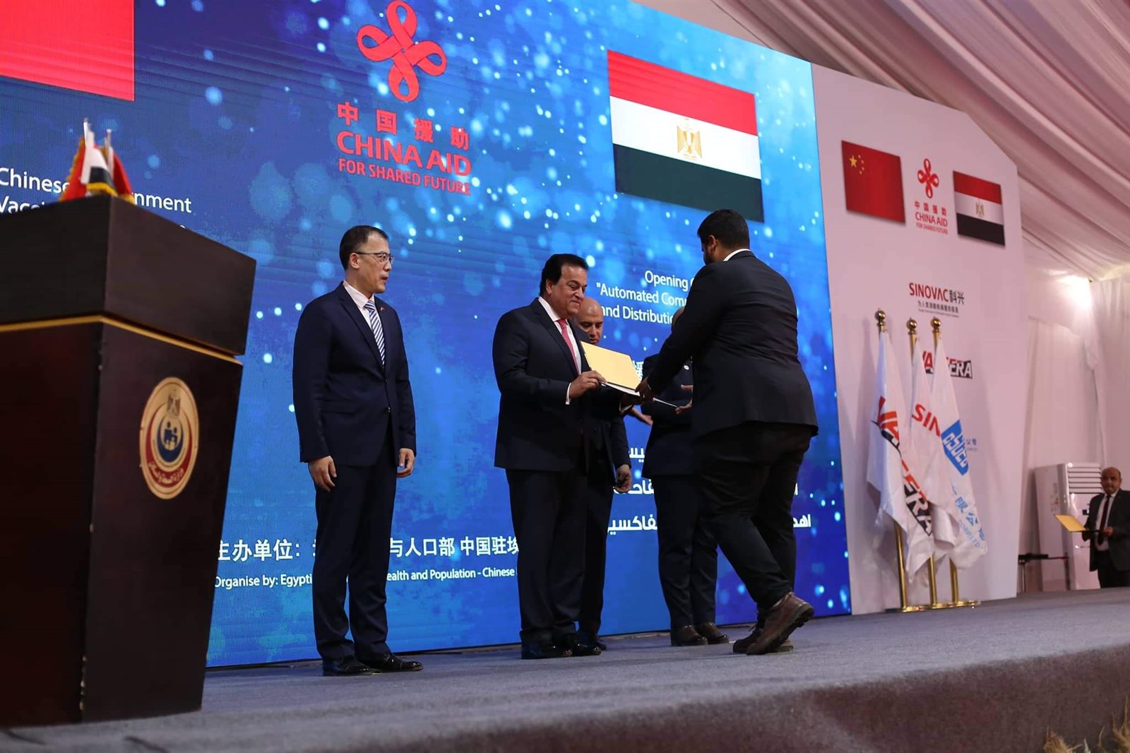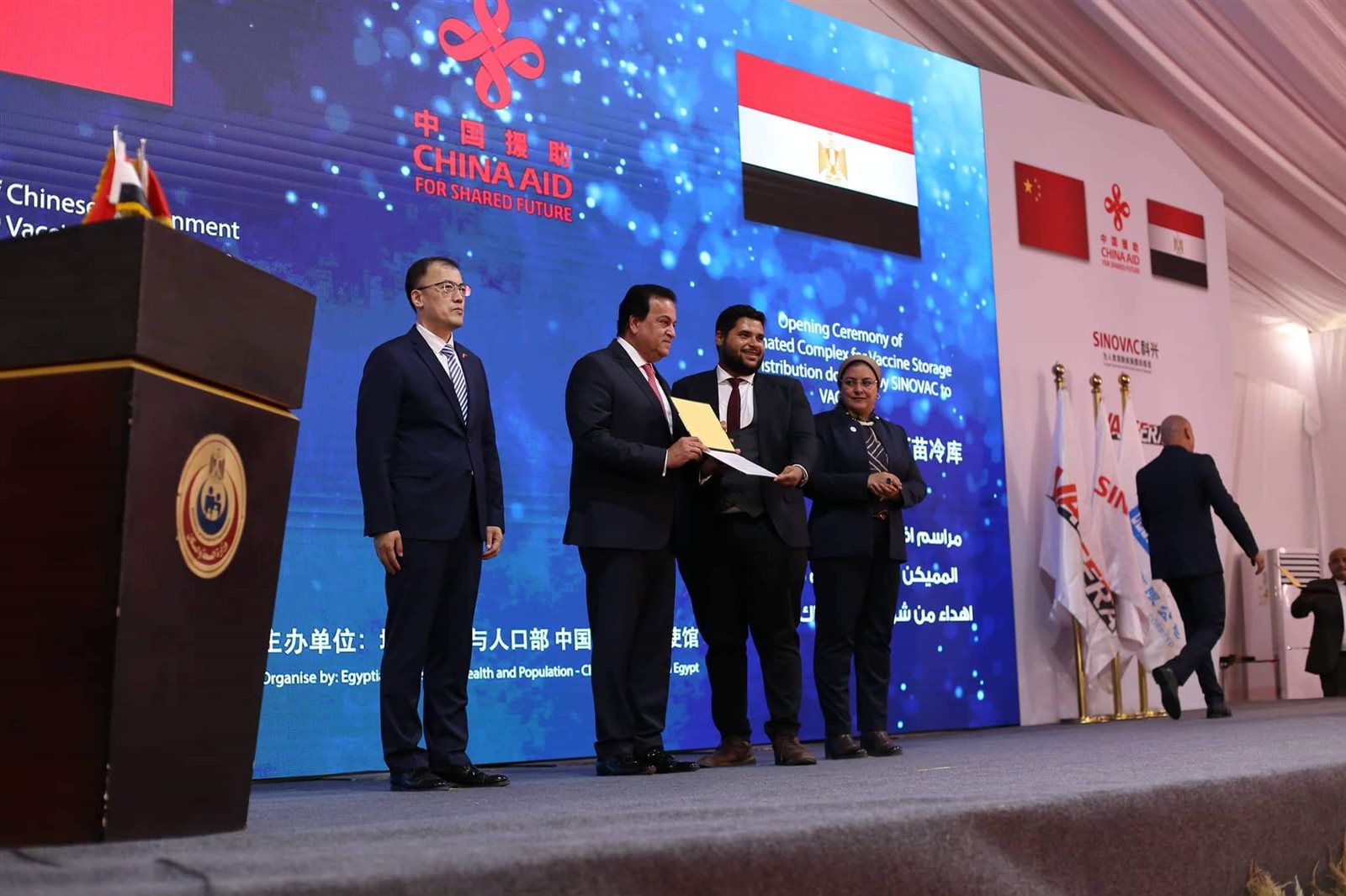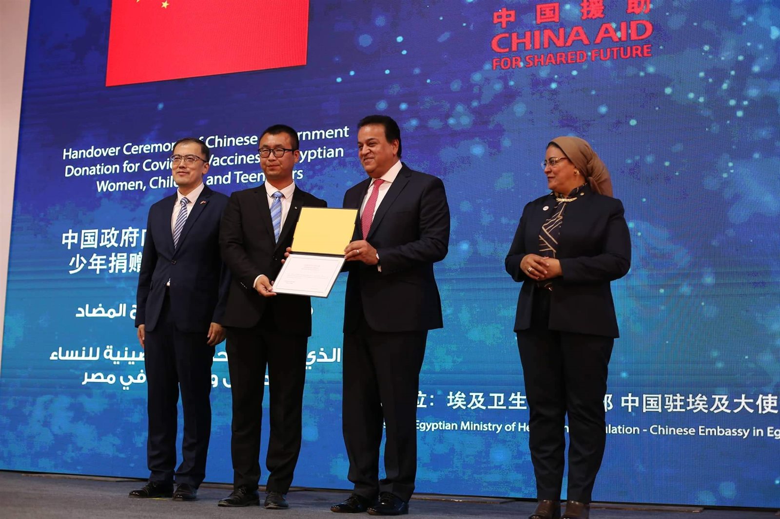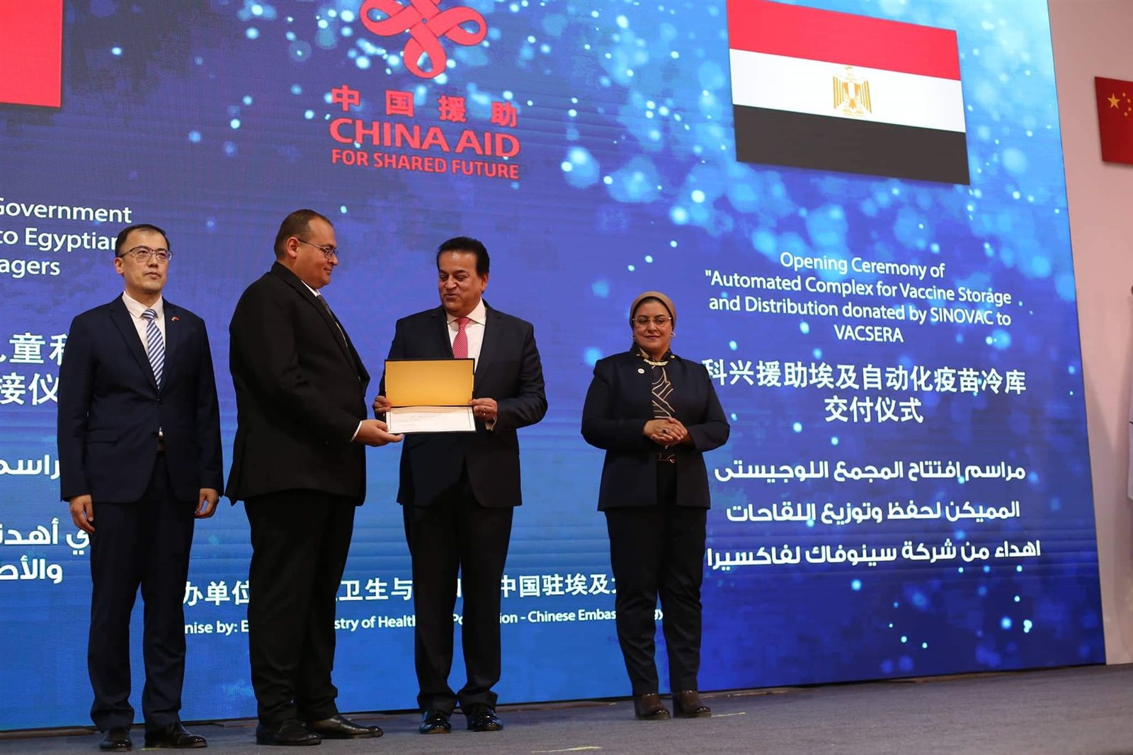 وشهد وزير الصحة والسكان، مراسم توقيع وثيقة استلام 10 ملايين جرعة من لقاح كورونا مقدمة من الحكومة الصينية، ضمن 60 مليون جرعة تهديها الحكومة الصينية للشعب المصري، حيث كشف الوزير أن مصر لديها مخزون من لقاحات فيروس كورونا يكفي حتى عام 2023.
