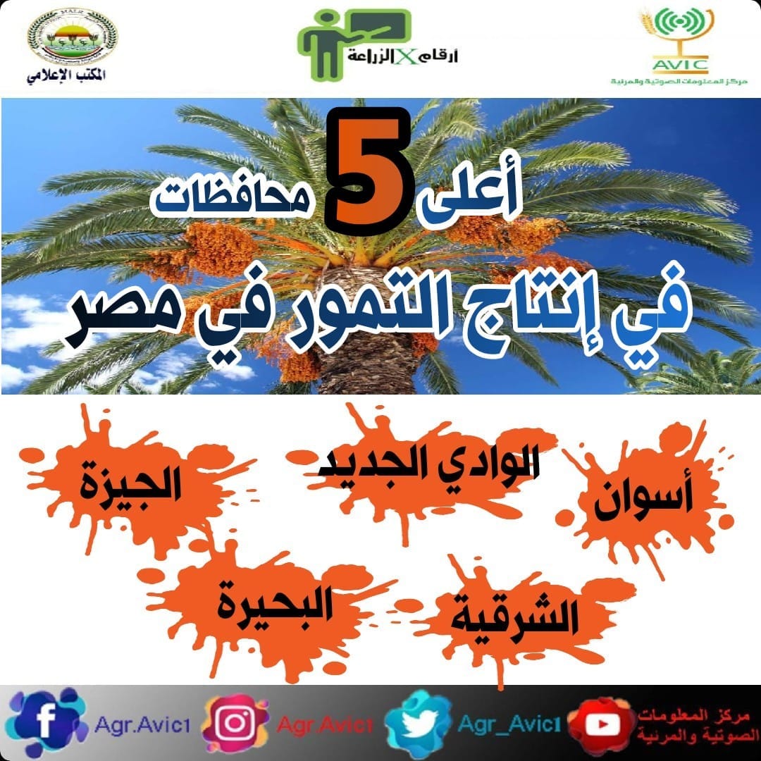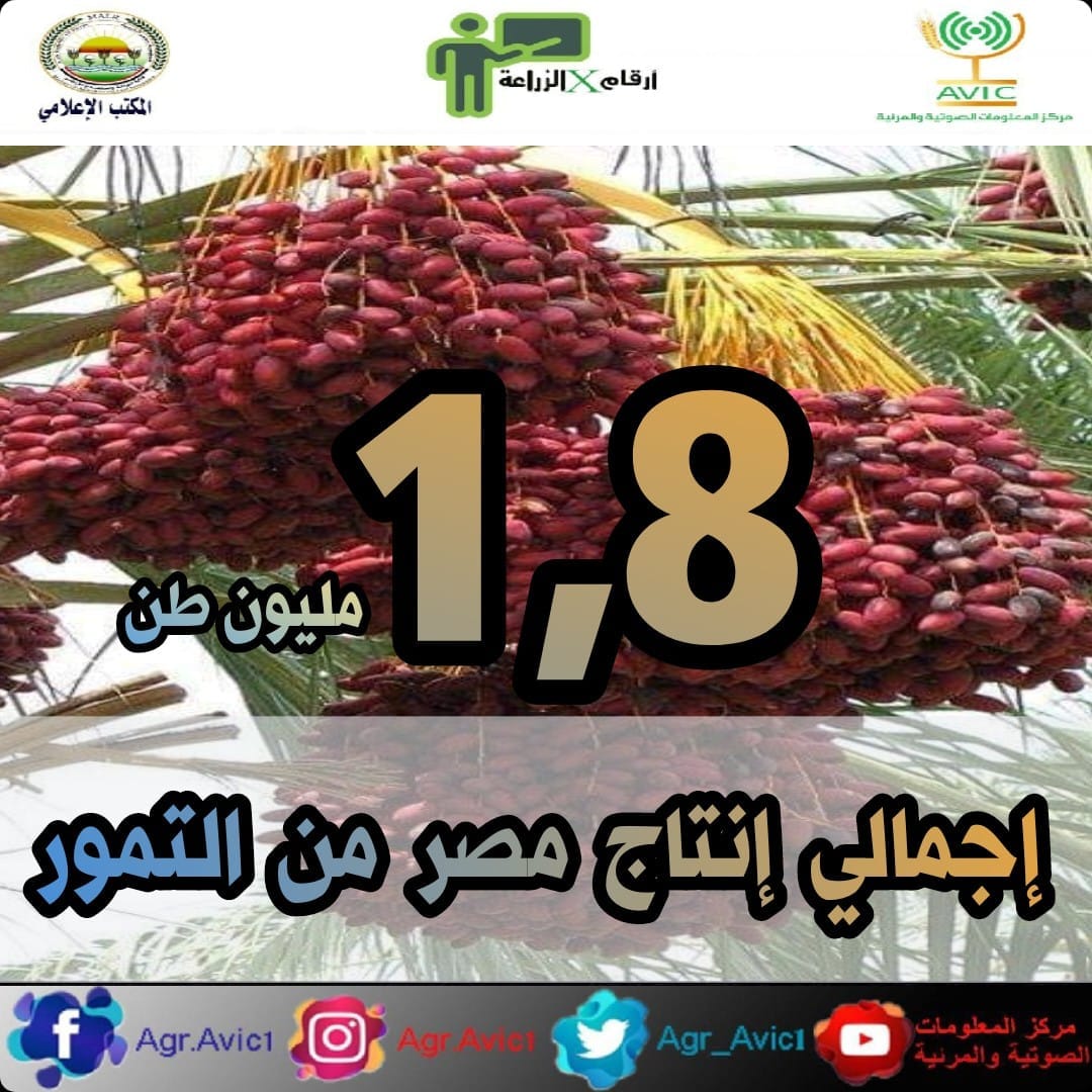 وتبلغ إجمالي إنتاجية التمور في مصر حوالي ١.٨ مليون طن، بينما تأتي أعلى ٥ محافظات في إنتاح التمور في مصر، كالتالي: أسوان، الوادي الجديد، الجيزة، الشرقية، والبحيرة.