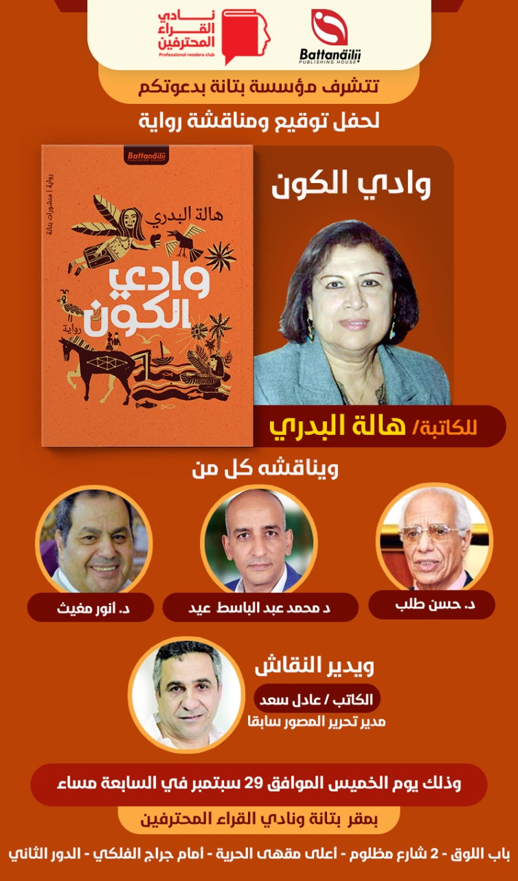 تنظم مؤسسة بتانة الثقافية حفلا لتوقيع رواية " وادي الكون " للكاتبة هالة البدري، وذلك يوم الخميس الموافق 29 سبتمبر في السابعة مساء بمقر بتانة ونادي القراء في باب اللوق عمارة 2 فوق قهوة الحرية أمام جراج الفلكي.