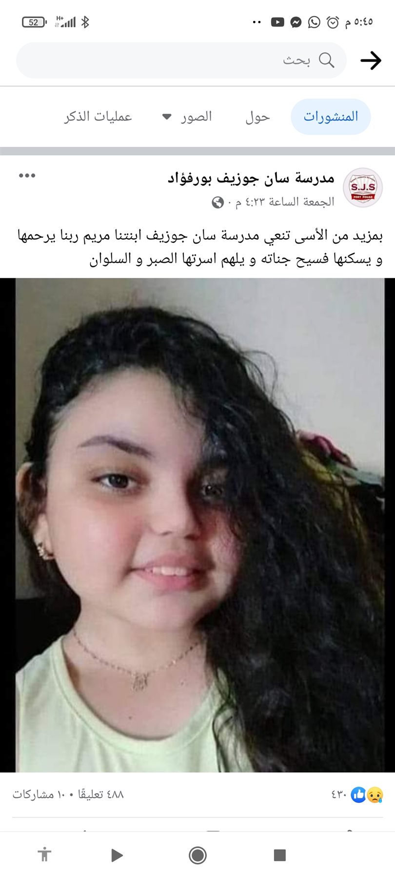 نعت مدرسة سان جوزيف في حي بورفؤاد التابع لمحافظة بورسعيد عبر صفحتها على فيسبوك الطفلة مريم الطالبة بالمدرسة التي تعرضت لحادث مأساوي تسبب في تهشيم رأسها داخل موتور سيارة من السيارات المتصادمة بمنتجع بورتو سعيد.