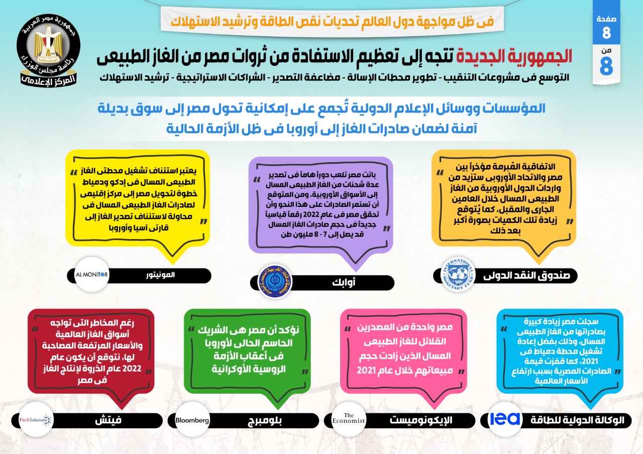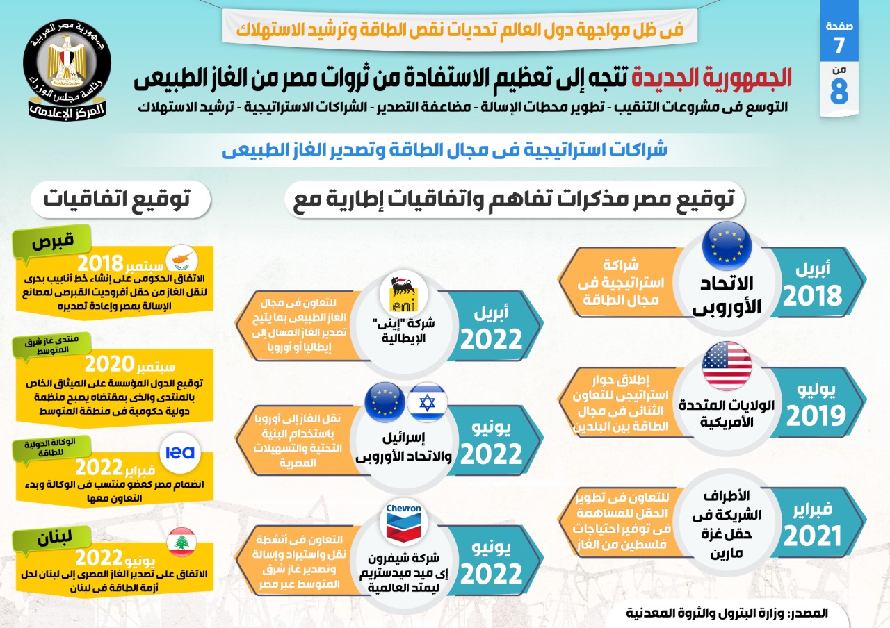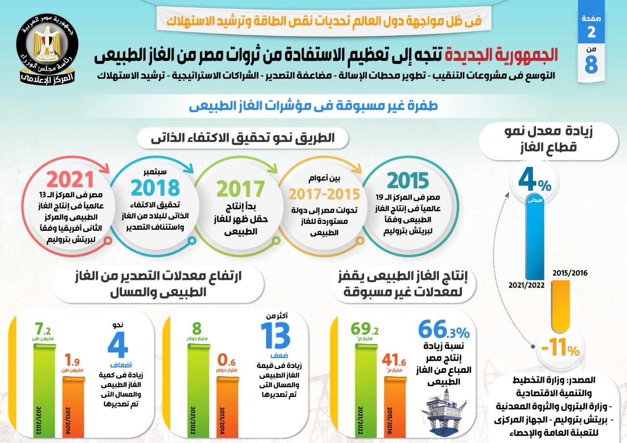 ونشر المركز الإعلامي لمجلس الوزراء تقريرًا تضمن إنفوجرافات تسلط الضوء على اتجاه الجمهورية الجديدة إلى تعظيم الاستفادة من ثروات مصر من الغاز الطبيعي، في ظل مواجهة دول العالم تحديات نقص الطاقة وترشيد الاستهلاك، والتي تشمل التوسع في مشروعات التنقيب، وتطوير محطات الإسالة، ومضاعفة التصدير، والشراكات الاستراتيجية، وترشيد الاستهلاك.