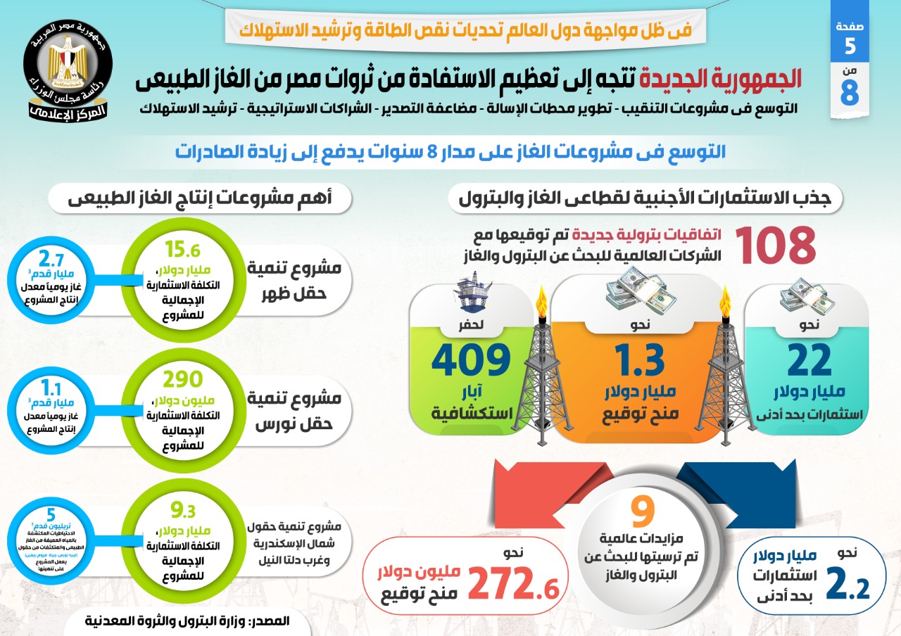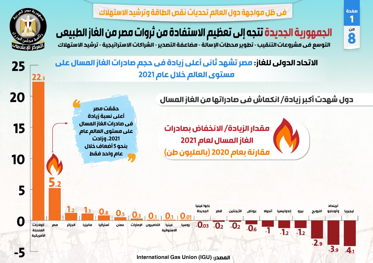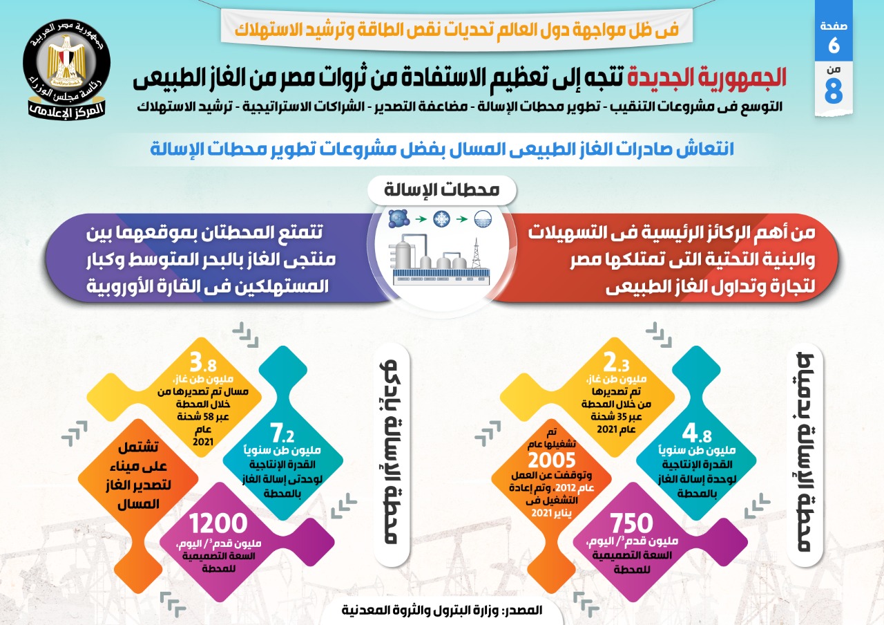 ونشر المركز الإعلامي لمجلس الوزراء تقريرًا تضمن إنفوجرافات تسلط الضوء على اتجاه الجمهورية الجديدة إلى تعظيم الاستفادة من ثروات مصر من الغاز الطبيعي، في ظل مواجهة دول العالم تحديات نقص الطاقة وترشيد الاستهلاك، والتي تشمل التوسع في مشروعات التنقيب، وتطوير محطات الإسالة، ومضاعفة التصدير، والشراكات الاستراتيجية، وترشيد الاستهلاك.