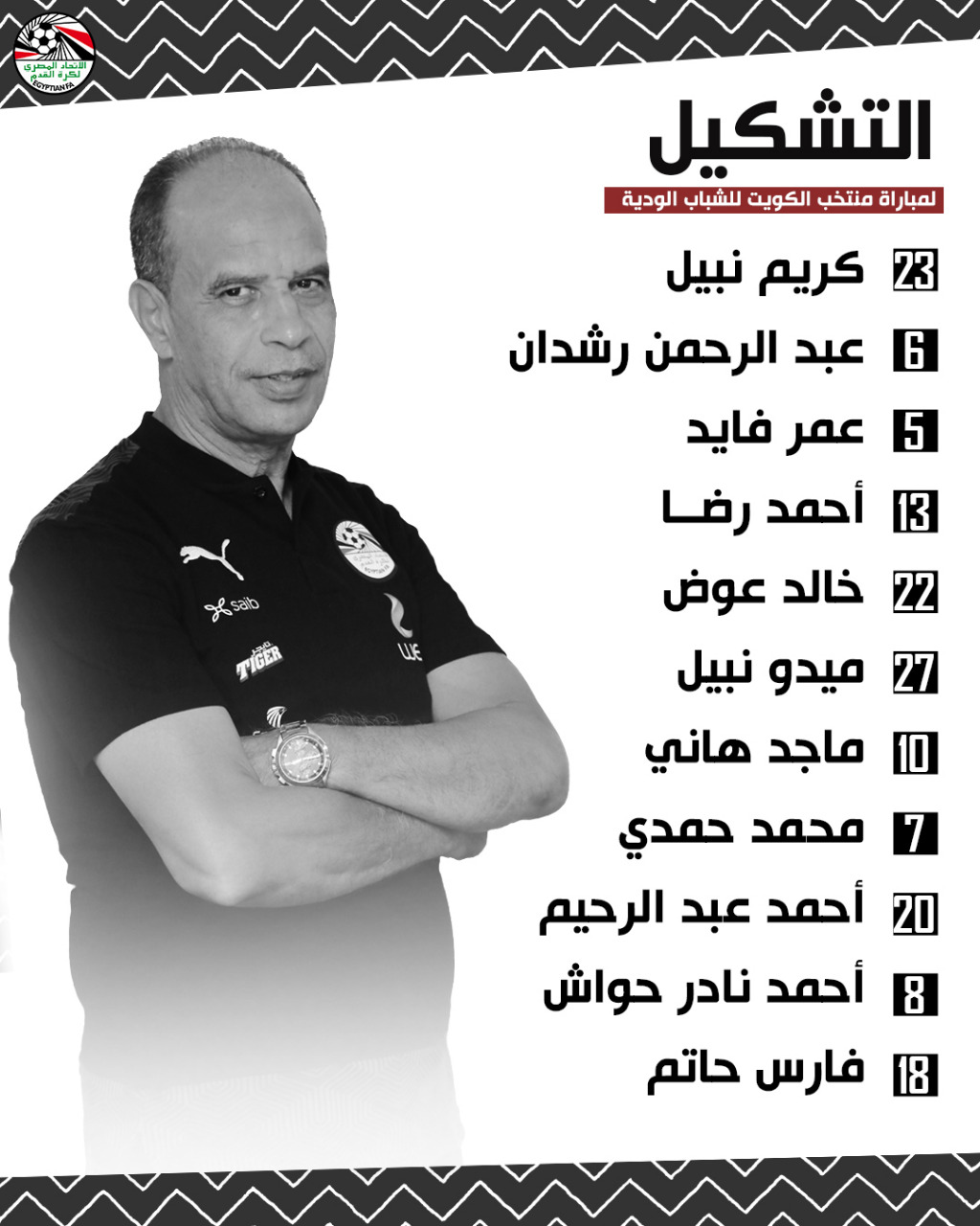 أعلن الجهاز الفني لمنتخب الشباب مواليد 2003 بقيادة محمود جابر تشكيلة الفريق لمواجهة نظيره الكويتي الودية المقرر انطلاقها في السادسة مساء على ملعب حرس الحدود بالأسكندرية.