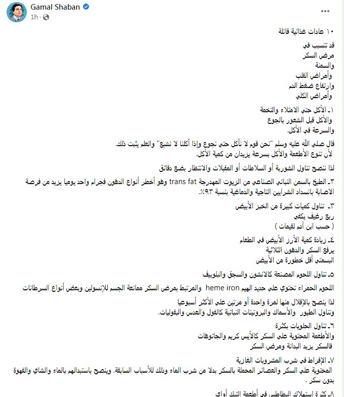 وكتب جمال شعبان تدوينة على الفيس بوك "١٠عادات غذائية قاتلة قد تتسبب في مرض السكر والسمنة وأمراض القلب وارتفاع ضغط الدم وأمراض الكلى"