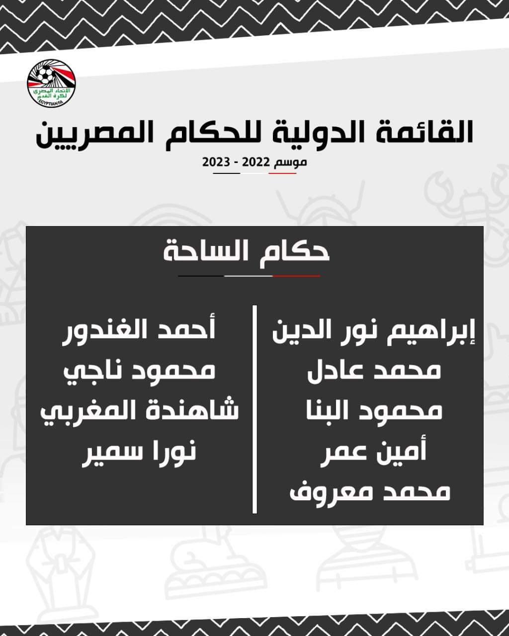 أعلن الاتحاد المصري لكرة القدم قائمة حكام الساحة الدوليين للموسم الجديد وهم: إبراهيم نور الدين، محمد عادل، محمود البنا، أمين عمر، محمد معروف، أحمد الغندور، محمود ناجي، شاهندة المغربي، نورا سمير.
