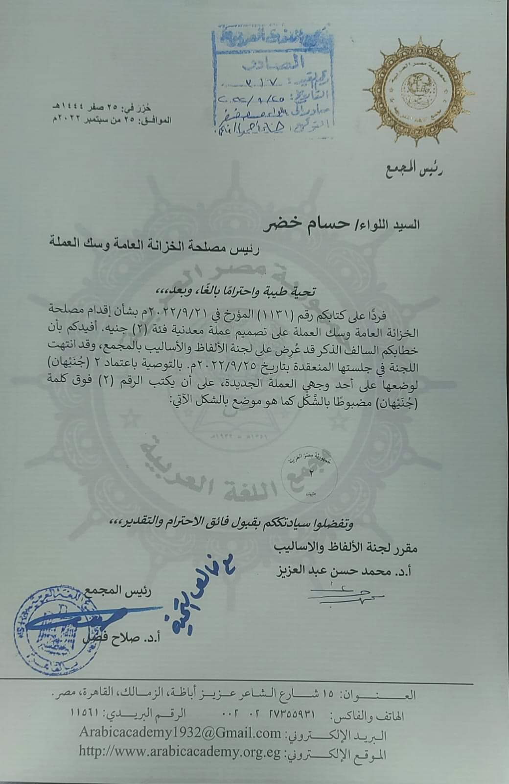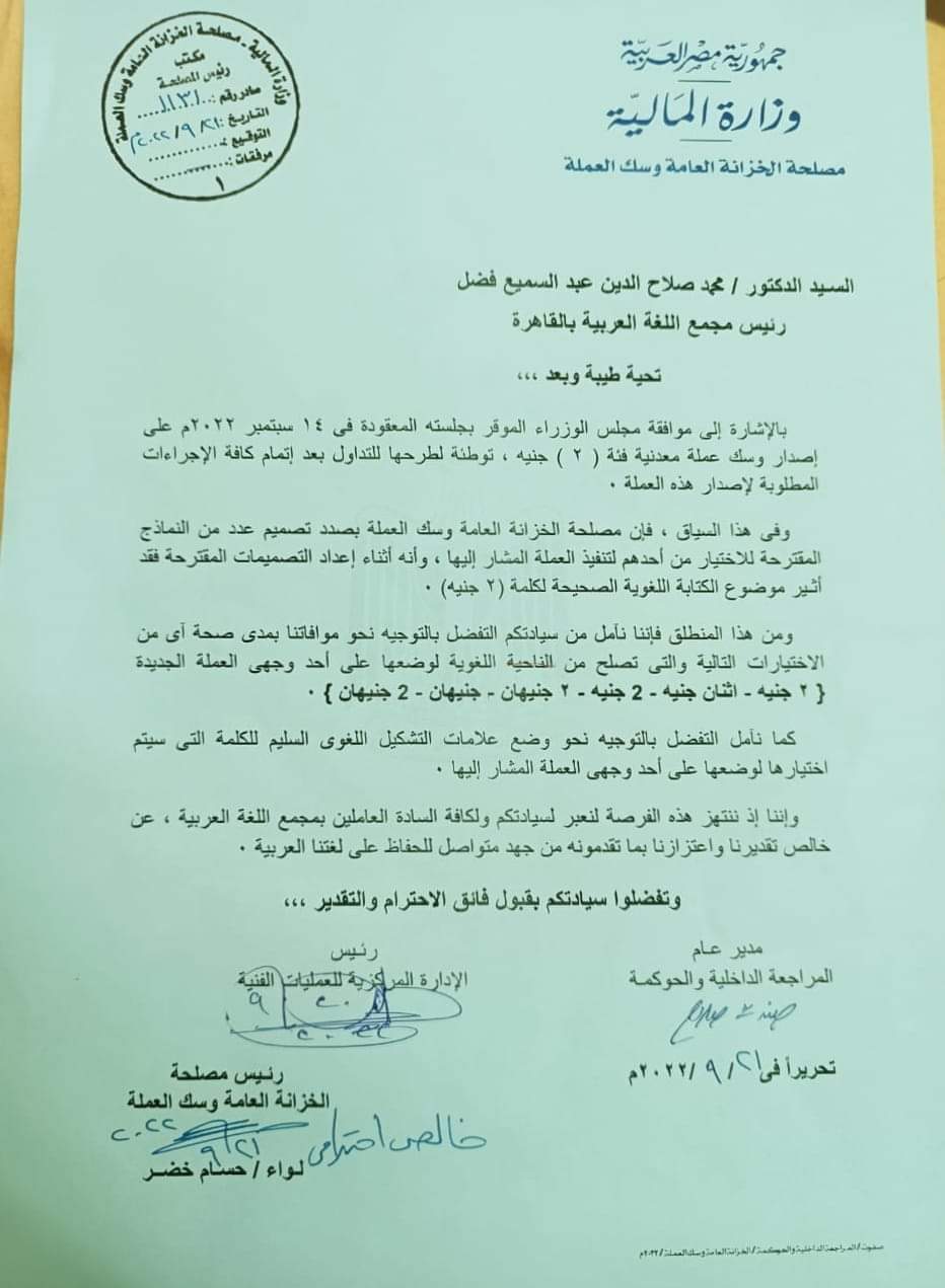 تلقى مجمع اللغة العربية خطابًا من اللواء حسام خضر رئيس "مصلحة الخزانة العامة وسك العملة" يستفتي فيه المجمع في بيان الكتابة اللغوية الصحيحة لكلمة (2 جنيه)، والتوجيه بمدى صحة أيٍّ من الاختيارات التالية التي تصلح من الناحية اللغوية لوضعها على أحد وجهي العملة الجديدة (2 جنيه- اثنان جنيه- 2 جنيه- 2 جنيهان- جنيهان- 2 جنيهان)، مع وضع علامات التشكيل اللغوي السليم للكلمة التي سيختارها المجمع لوضعها على أحد وجهي العملة المشار إليها.