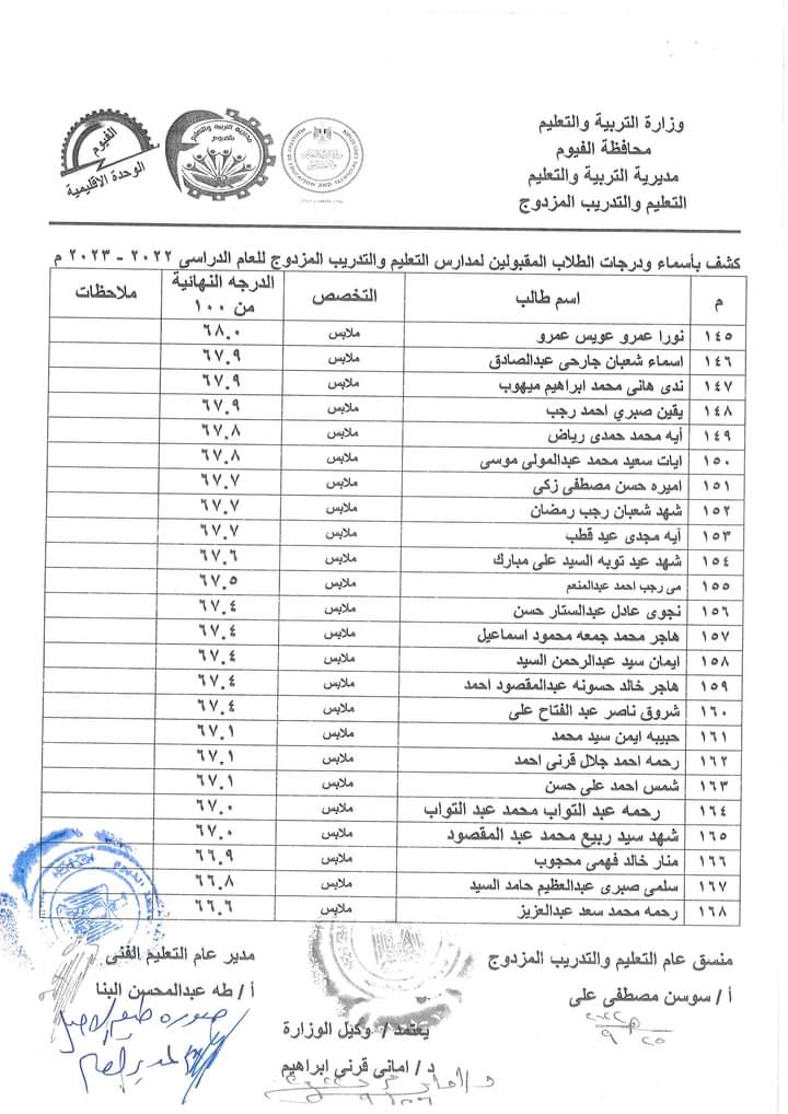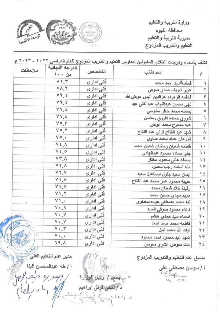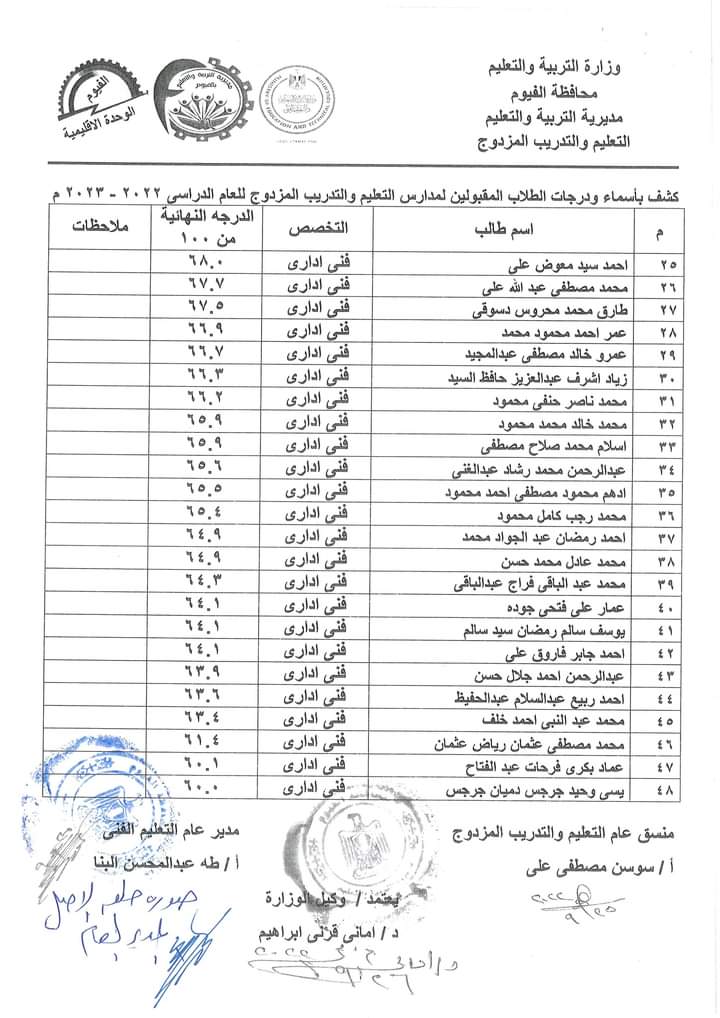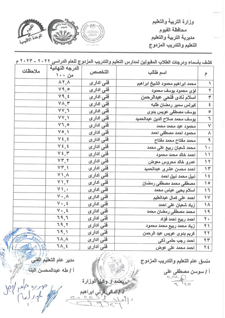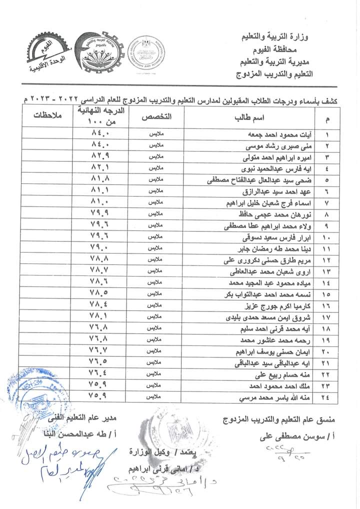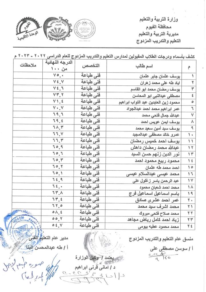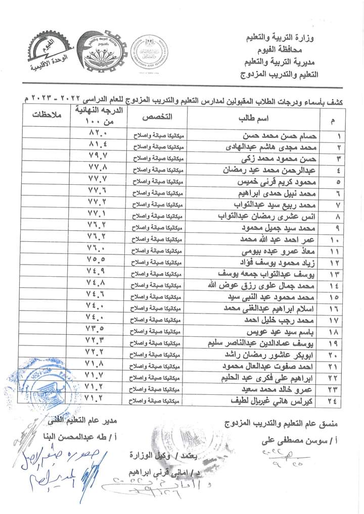 الفيوم تعلن نتيجة القبول بمدارس التعليم والتدريب المزدوج