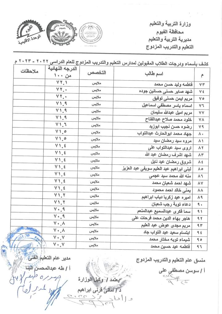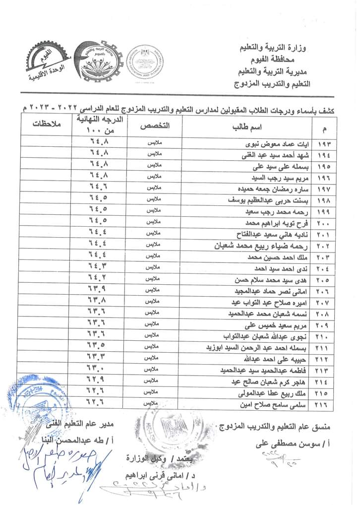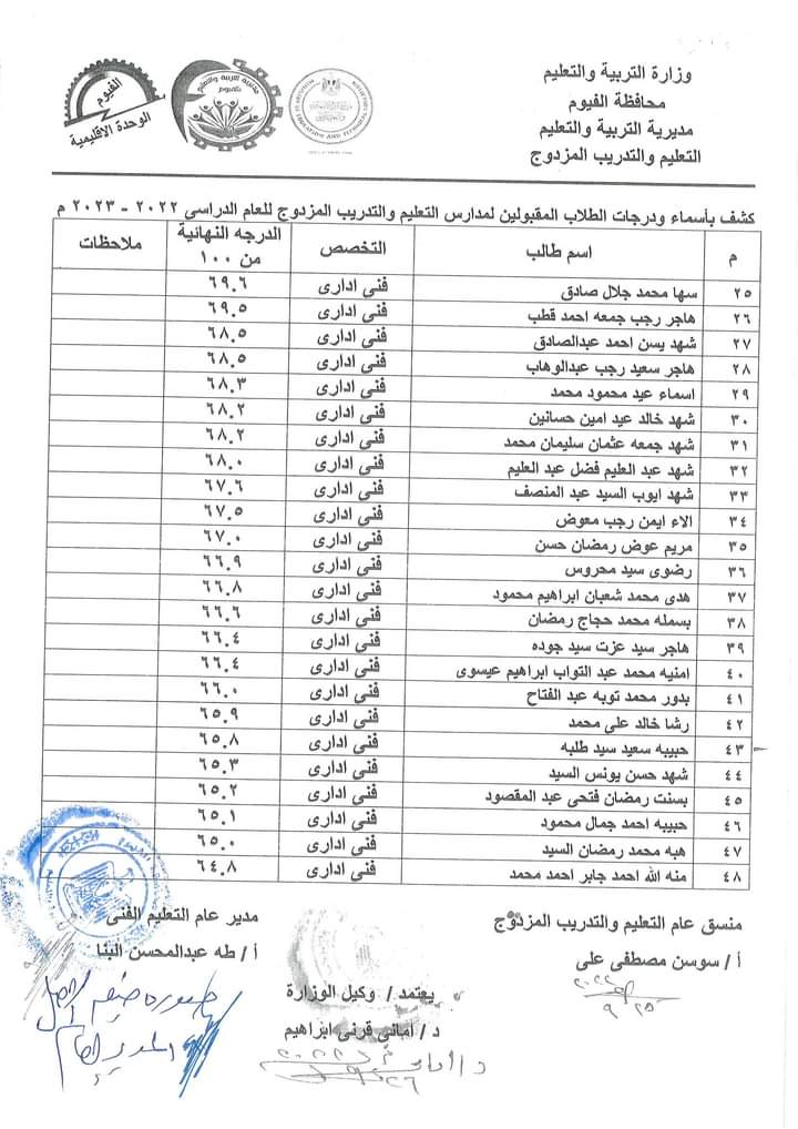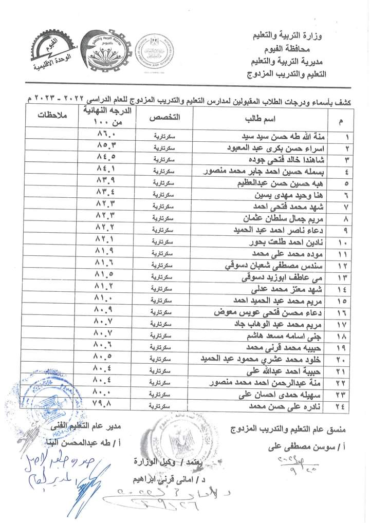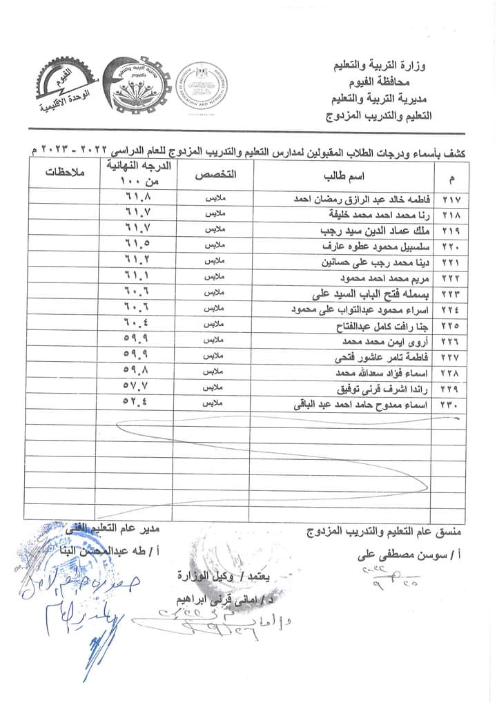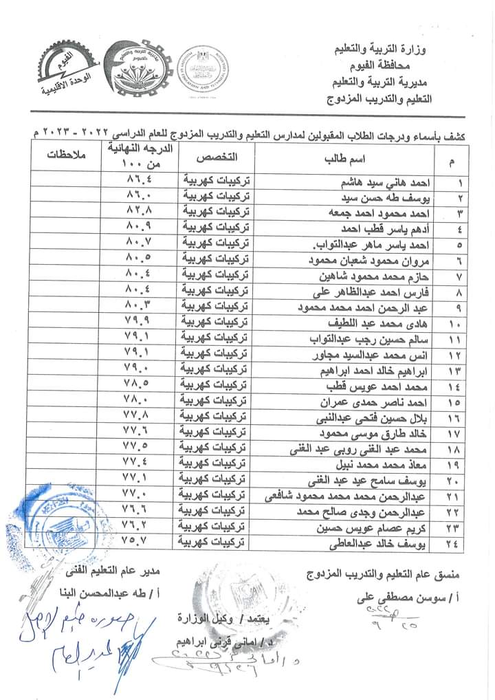 الفيوم تعلن نتيجة القبول بمدارس التعليم والتدريب المزدوج