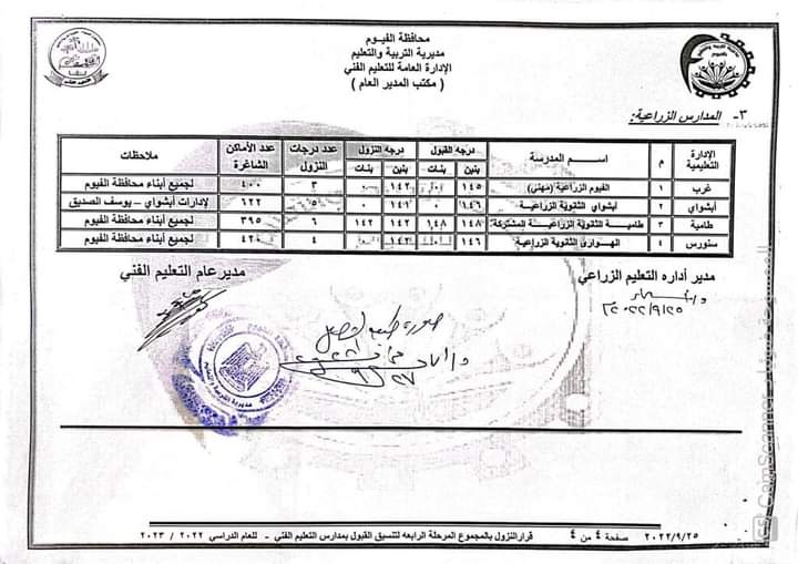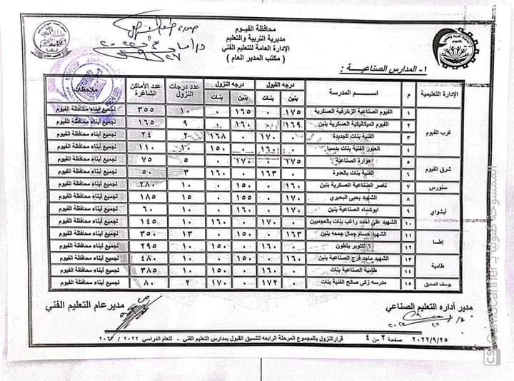 من ناحية أخري اعتمد اليوم الدكتور أحمد الأنصاري محافظ الفيوم، النزول بدرجات قبول الطلاب بالمدارس الفنية (صناعي، زراعي ) على مستوى محافظة الفيوم للعام الدراسي الجديد ٢٠٢٣/٢٠٢٢، لاستكمال الكثافات بالمدارس الفنية بجميع الإدارات التعليمية وبما يتفق مع احتياجات المدارس.