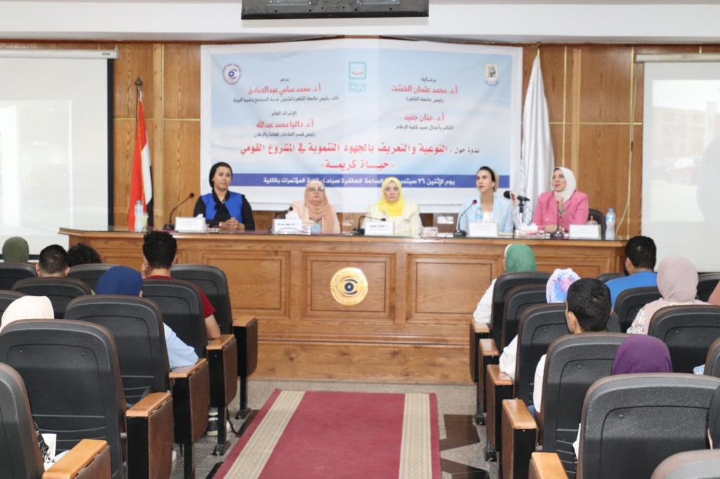 عقدت مؤسسة حياة كريمة أول ندوة توعوية للشباب الجامعي وتعريفهم بالمبادرة الرئاسية "حياة كريمة"، وذلك لكون المؤسسة مظلة العمل التطوعي والتنموي في المبادرة الرئاسية حياة كريمة بهدف "نشر ثقافة العمل المجتمعي والتطوعي" بين شباب الجامعات.