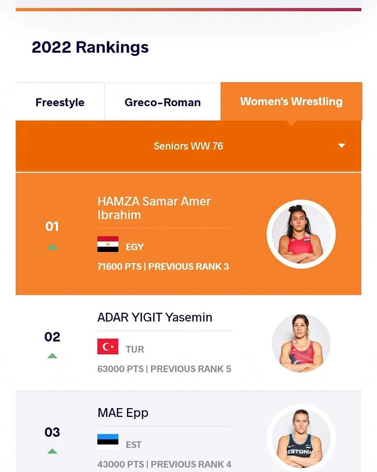 تصدرت سمر حمزة لاعبة المنتخب الوطني للمصارعة، التصنيف الدولي لمنافسات وزن 76 كجم، متفوقة على عدد كبير من بطلات اللعبة.