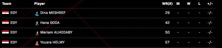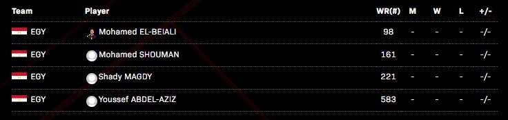 وضمت قائمة منتخب السيدات كلا من، دينا مشرف وهنا جودة ويسرا حلمي ومريم الهضيبي وآلاء يحيى، فيما ضم منتخب الرجال كلا من عمر عصر ومحمد البيلي وأحمد صالح ومحمد شومان وخالد عصر.