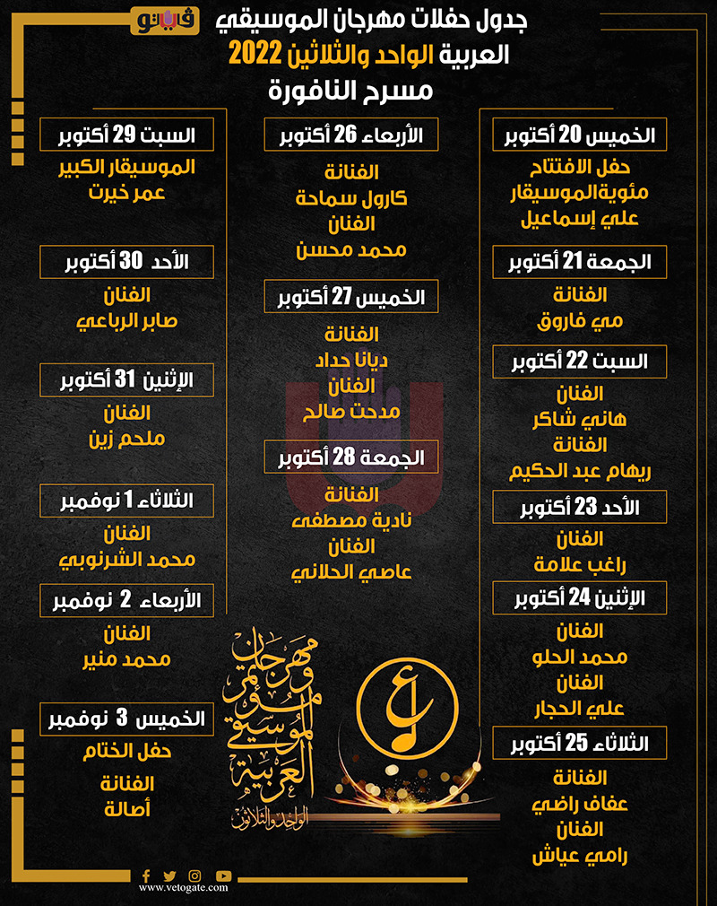 جدول حفلات مهرجان الموسيقى العربية الواحد والثلاثين على مسرح النافورة | إنفوجراف الأربعاء 28/سبتمبر/2022 - 08:00 م 9/28/2022 8:00:35 PM مهرجان الموسيقى العربية شارك طباعة 18 حجم الخط شارك طباعة