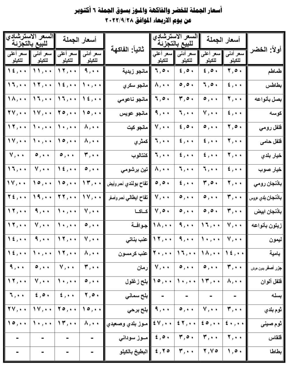 وسجلت أسعار الفلفل الألوان ما بين 3 و7 جنيهات، وسجل كيلو القلقاس من 3 إلى 6 جنيهات، وبلغ سعر الثوم من 7 إلى 11 جنيها، وسعر خس كابوتشي 4.50 جنيه.