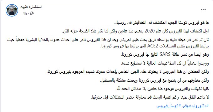 وكتب الدكتور وليد شوقي تدوينة عبر الفيس بوك: “ما هو فيروس "خوستا-2" الجديد المكتشف فى الخفافيش فى روسيا... أول اكتشاف لهذا الفيروس كان عام 2020 بمعنى منذ عامين ولكن لما تثار هذه الضجة حوله الآن".
