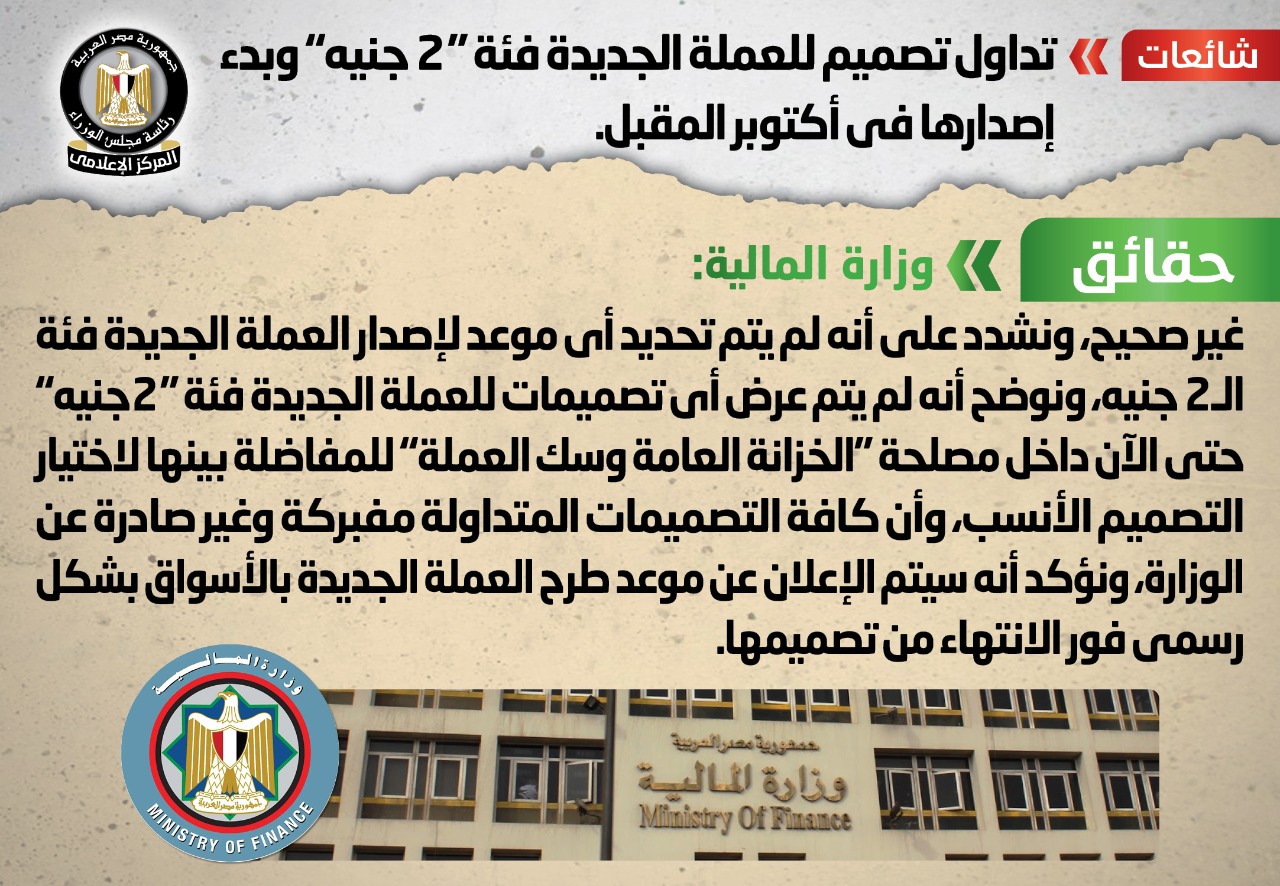 رصد المركز الاعلامي بمجلس الوزراء تداول تصميمًا للعملة الجديدة فئة "2 جنيه" وبدء إصدارها في أكتوبر المقبل، وقام المركز الإعلامي لمجلس الوزراء بالتواصل مع وزارة المالية، والتي نفت تلك الأنباء.