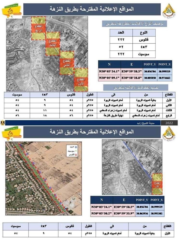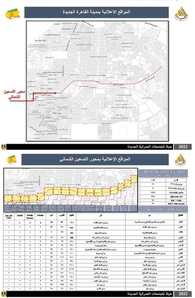 وأضافت المهندسة إيمان نبيل، رئيس الإدارة المركزية للتنمية بهيئة المجتمعات العمرانية الجديدة – المشرف على وحدة تنظيم الإعلانات بالطرق العامة بالهيئة، أنه تم طرح ١٧ قطاعا بمحور التسعين الشمالي بمدينة القاهرة الجديدة، وجزء من طريق الواحات مقسم إلى 4 قطاعات وجزء من طريق وصلة دهشور الشمالية مقسم إلى قطاعين، وجزء من محور 26 يوليو مقسم إلى قطاعين بمدينة 6 أكتوبر، وأجزاء من طرق " النزهة – الشباب – المستقبل – البستان – طريق الخدمة مدخل مدينة الشيخ زايد 4" مقسمة إلى 10 قطاعات بمدينة الشيخ زايد.