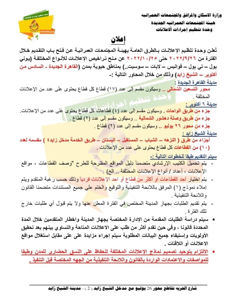قال المهندس عبدالمطلب ممدوح، نائب رئيس هيئة المجتمعات العمرانية الجديدة لقطاع التنمية وتطوير المدن، انه تم فتح باب التقدم خلال فترة ٢٦/٩/٢٠٢٢ حتى ٢٥/١٠/٢٠٢٢ لمنح تراخيص الإعلانات بمناطق حيوية بمدن ( القاهرة الجديدة – 6 أكتوبر – الشيخ زايد ) للأنواع الإعلانية المختلفة التالية ( يوني بول - فوانيس - لابات - سوسيت ).
