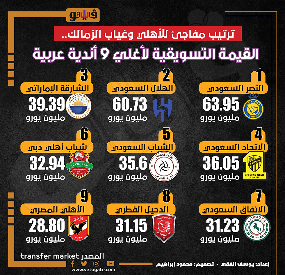 ترتيب مفاجئ للأهلي وغياب الزمالك.. القيمة التسويقية لأغلي 9 أندية عربية|انفوجراف السبت 01/أكتوبر/2022 - 07:05 م 10/1/2022 7:05:27 PM الأهلي والزمالك يوسف الفقي شارك طباعة 18 حجم الخط شارك طباعة الأهلي الزمالك أغلى 10 أندية عربية القيمة التسويقية للأهلي والزمالك القيمة التسويقية لأغلى 10 أندية عربية