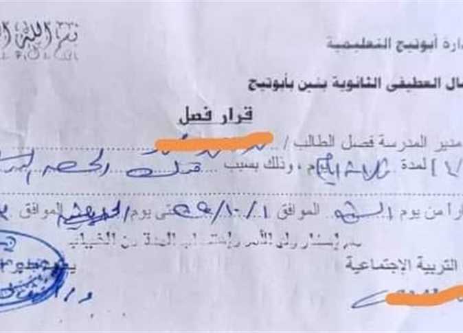 وتداول رواد موقع التواصل الاجتماعي فيس بوك صورة لقرار الفصل الذي تضمن قيام مدير مدرسة جمال العطيفي الثانوية بنين بمركز أبوتيج التابع لمحافظة أسيوط بفصل أحد الطلاب لمدة 3 أيام بدءا من اليوم الأول للعام الدراسي بعد ثبوت تركه الحصة الدراسية وهروبه منها فورا وذلك بعد حضوره طابور الصباح واخذ الغياب في الحصة الأولي.
