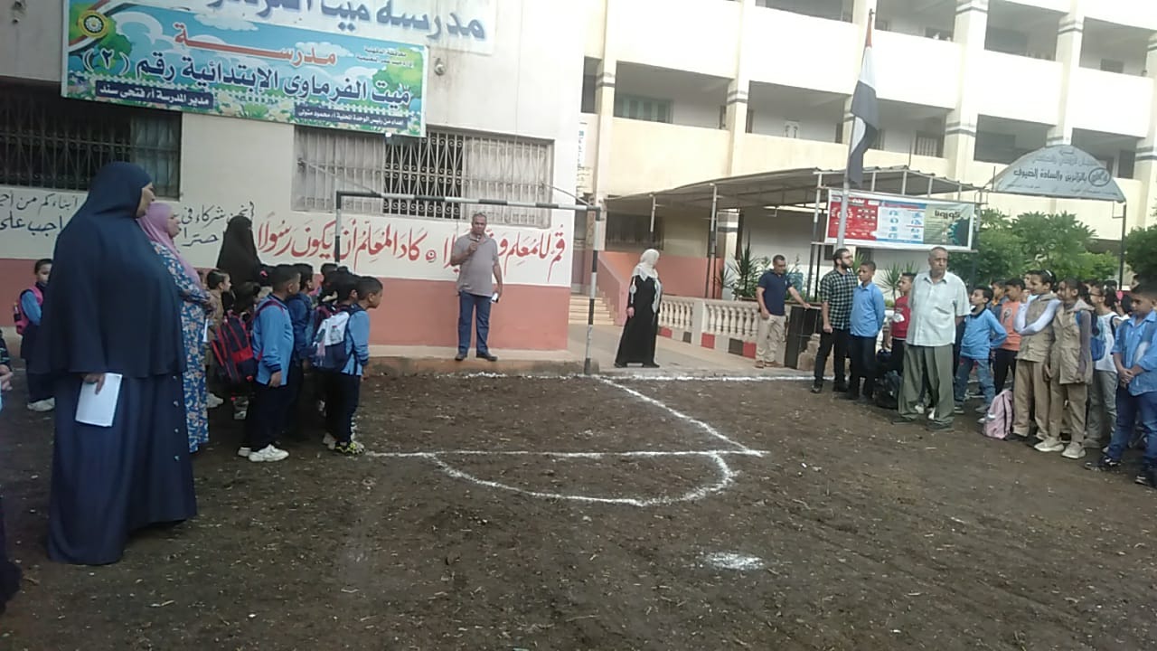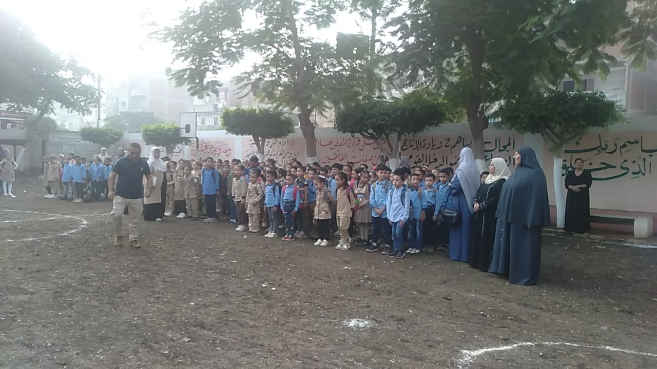 ووقف الطلاب والطالبات بفناء المدرسة في طابور الصباح كما وقف كل مدرس امام الفصل المسئول عنه وصعد الطلاب علي انغام الاغاني الوطنية.