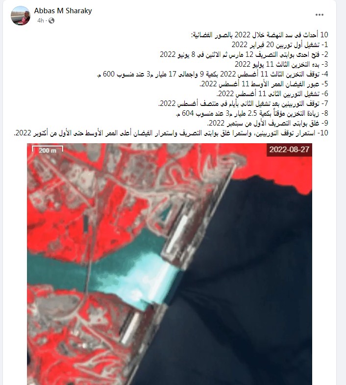وكتب الدكتور عباس شراقي تدوينة على الفيس بوك: "10 أحداث فى سد النهضة خلال 2022 بالصور الفضائية: 1- تشغيل أول توربين 20 فبراير 2022. 2- فتح إحدى بوابتي التصريف 12 مارس ثم الاثنين فى 8 يونيو 2022. 3- بدء التخزين الثالث 11 يوليو 2022"