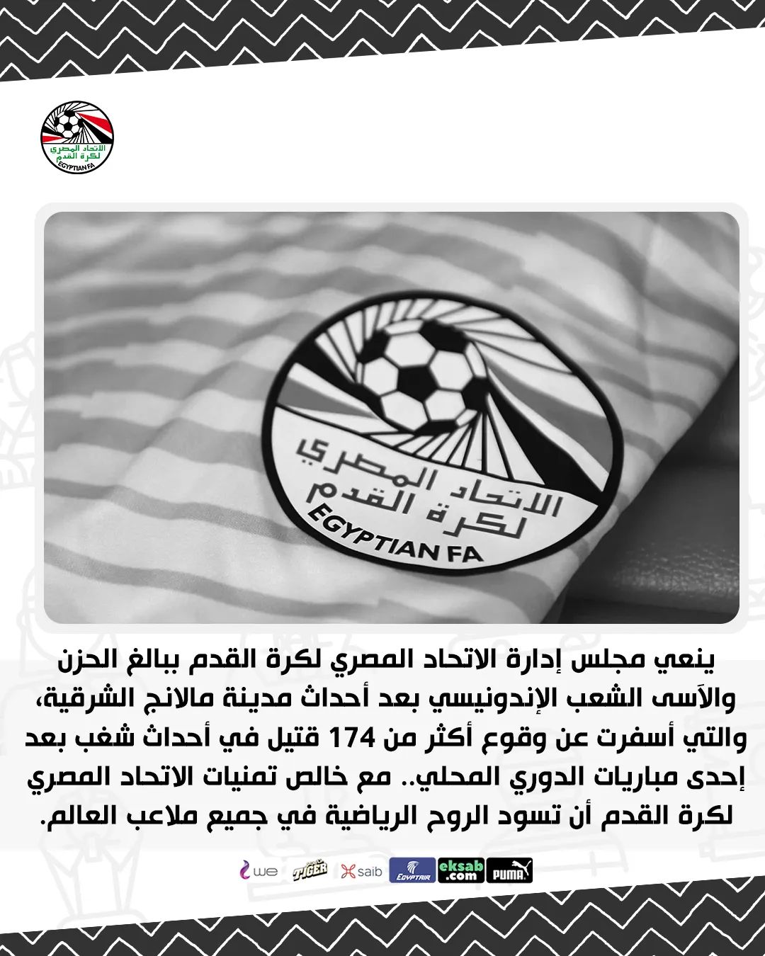 قدم مجلس إدارة الاتحاد المصري لكرة القدم خالص التعزية والمواساة للشعب الإندونيسي بعد أحداث مدينة مالانج الشرقية، والتي أسفرت عن وقوع أكثر من 174 قتيلا في أحداث شغب بعد إحدى مباريات الدوري المحلي