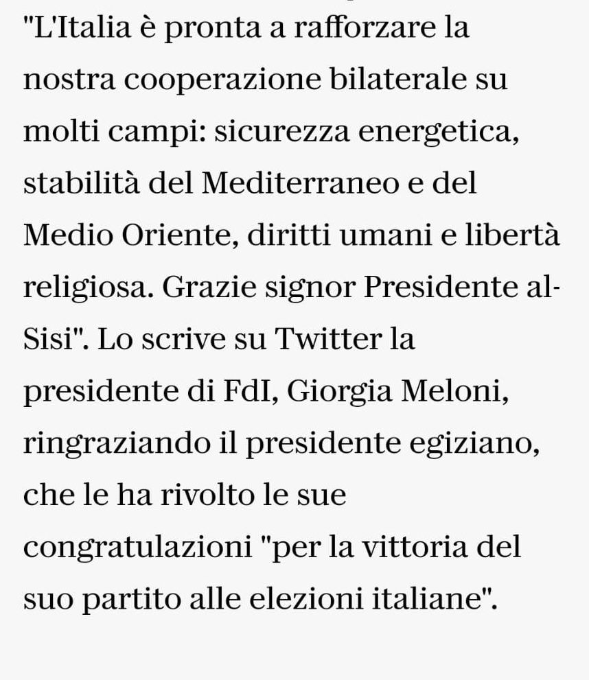 عبرت جورجيا ميلونى زعيمة حزب اخوة ايطاليا الفائز فى الانتخابات العامة في ايطاليا عن شكرها وامتنانها لتهنئة الرئيس السيسي لها أمس.. حيث اكدت استعداد ايطاليا للتعاون المشترك ودعم العلاقات الثنائية مع مصر خاصة فى قطاعات أمن الطاقة وقضايا الشرق الأوسط، واستقرار حوض المتوسط فضلًا عن ملف حرية الأديان.