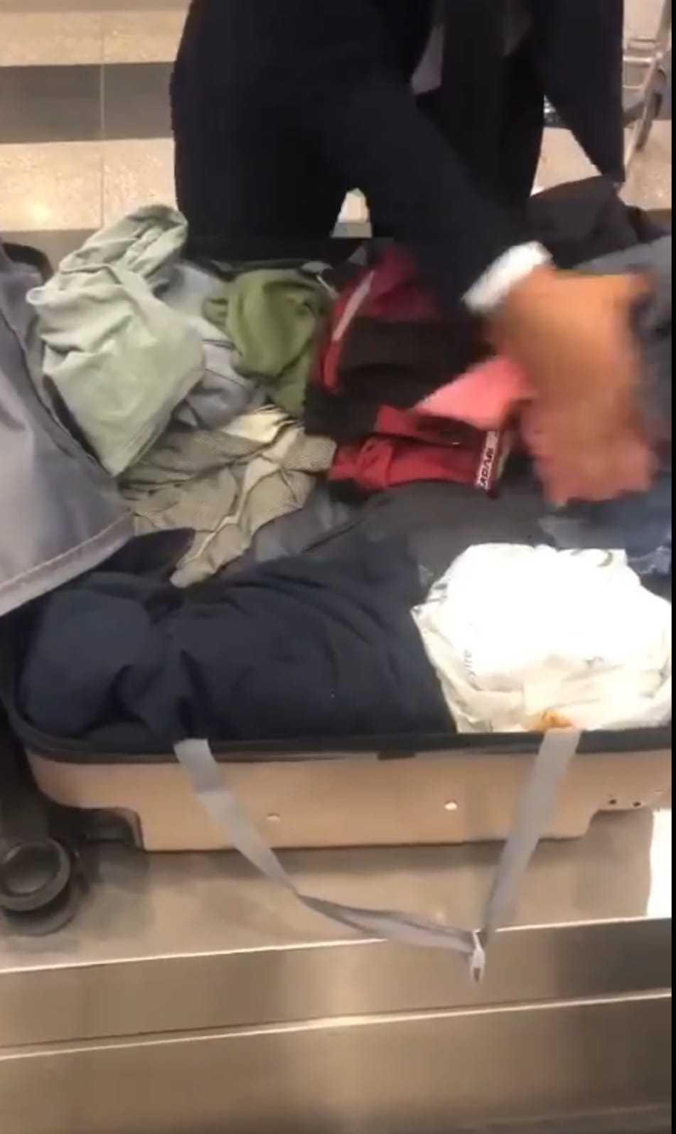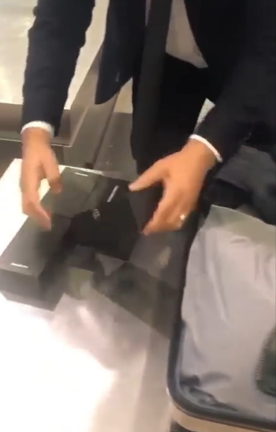 وبالعرض على تامر عادل مدير الحركة المشرف علي العمل بالصالة الخضراء قام بتكليف أحمد عادل مأمور الجمرك المكلف بالعمل بالصالة الخضراء بتفتيش أمتعة الراكب فتبين وجود ١٩ هاتف محمول ماركة سامسونج نوت ٢٠ مخبأة بين طيات ملابسه داخل حقائبه.