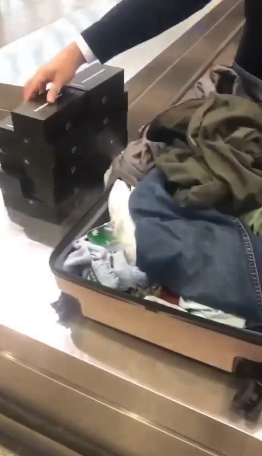 و بتمرير أمتعته الشخصية علي جهاز الفحص بأشعة X-RAY بمعرفة إبراهيم طه مأمور الفحص وفرج حمدي رئيس القسم فتلاحظ وجود أشياء متماثلة يشتبه أن تكون هواتف محمولة.