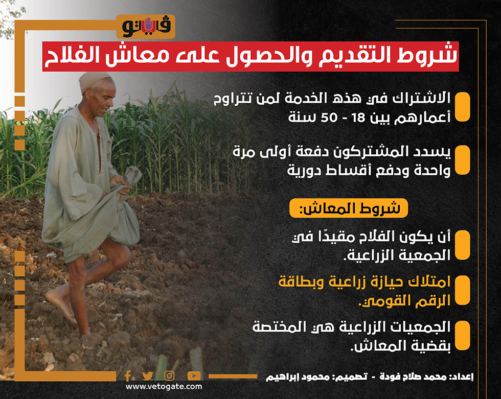 شروط التقديم والحصول على معاش الفلاح | إنفوجراف الثلاثاء 04/أكتوبر/2022 - 06:03 م 10/4/2022 6:03:31 PM معاش الفلاح - محمد صلاح فودة شارك طباعة 18 حجم الخط شارك طباعة ابو صدام نقيب الفلاحين الأوراق المطلوبة لمعاش الفلاح معاش الفلاح الجمعيات الزراعيه