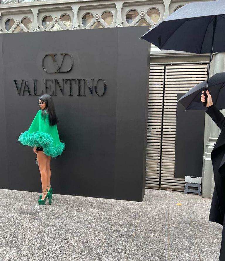 أما عارضة الأزياء نجود الرميحي فقد ارتدت خلال عرض أزياء فالنتينو، فستانًا قصيرًا باللون الأبيض المزين بخطوط سوداء، مع جوارب طويلة باللون الأسود، وحذاء بلاتفورم مدبب باللون الأسود أيضًا.