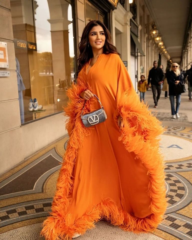بينما اختارت الفنانة مي عمر الظهور بفستان طويل باللون البرتقالي، مزين بطبقة من الريش عند أطرفه، مع حقيبة يد باللون الرمادي مزينة بلوجو دار فالنتينو.