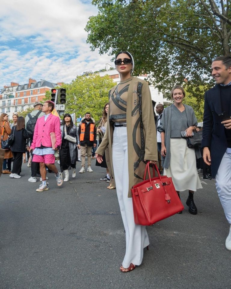 واستعرضت الفاشينيستا حنين الصيفي إطلالتها خلال عرض دار هيرمس، وظهرت ببنطلون أبيض واسع مع بلوفر بني فاتح، ارتدت فوقه كارديجان طويلا، مع حقيبة يد كبيرة باللون الأحمر.