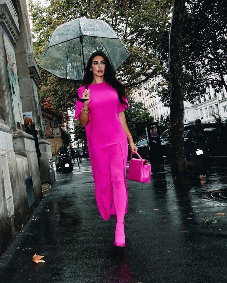 وارتدت النجمة ياسمين صبري فستانًا طويلًا باللون الزهري، مع حذاء بالكعب العالي وجوارب وحقيبة يد بنفس اللون، خلال عرض أزياء دار فالنتينو.