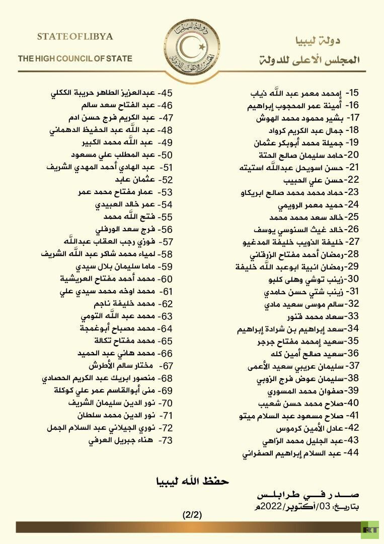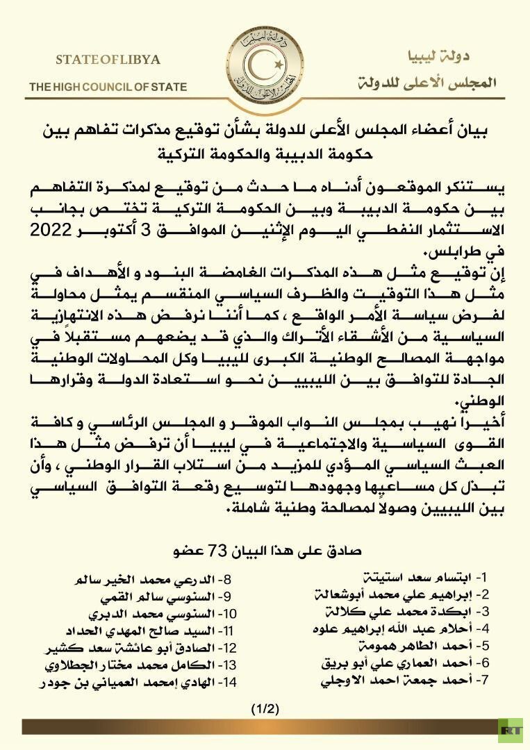 أعلن 73 عضوا بمجلس الدولة الليبي، رفضهم لتوقيع حكومة الوحدة الوطنية المؤقتة مذكرة تفاهم مع تركيا في المجال النفطي، معتبرين أن "هكذا مذكرات غامضة البنود".