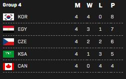 بدأ منتخب مصر مشاركته في دور المجموعات بالفوز على منتخب السعودية، ثم فوز على منتخب كندا، قبل الخسارة أمام منتخب كوريا، والفوز مجددا على منتخب جمهورية التشيك في الجولة الرابعة.