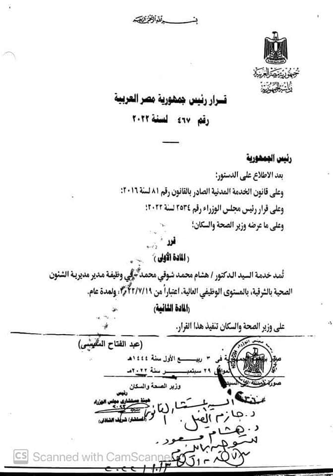 الجدير بالذكر أن القرارات الخاصة بمديرية الشئون الصحية بالمحافظات كانت تصدر من وزير الصحة.