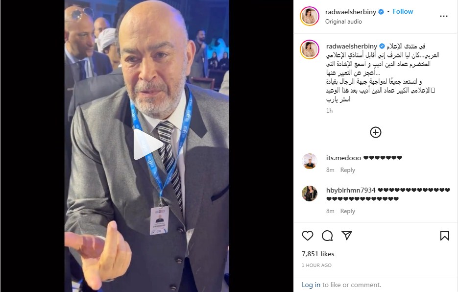 وكتبت رضوى الشربيني على حسابها الرسمي بموقع التواصل الاجتماعي إنستجرام: "في منتدى الإعلام العربي…كان ليا الشرف إني أقابل أستاذي الإعلامي المخضرم عماد الدين أديب وأسمع الإشادة التى أعجز عن التعبير عنها…".
