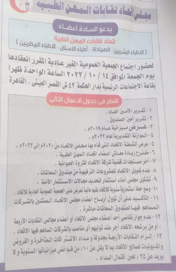 وننشر جدول أعمال الجمعية العمومية غير العادية لاتحاد المهن الطبية: