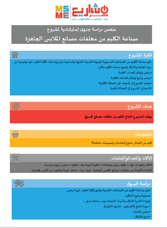 تعتبر صناعة الكليم من الصناعات النسيجية القديمة المتميزة والمستمرة حتى يومنا هذا لكثرة الطلب عليها وتنوعها من حيث الخامة والشكل، ويُعد مشروع “صناعة الكليم من مخلفات مصانع الملابس” أحد أهم أفكار المشروعات الصغيرة والمتوسطة حيث يهدف إلى توفير فرص عمل مناسبة واستغلال رواج هذه التجارة لانتشار أنواع كثيرة منها داخل السوق المصرية.