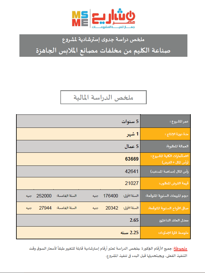 وكشفت دراسة جدوى استرشادية صادرة عن جهاز تنمية المشروعات الصغيرة حصلت" فـيتـو" على نسخة منها، أن صافي الأرباح السنوية المتوقعة للمشروع تصل إلى 20 ألف جنيه بنهاية السنة الأولى للمشروع، مقارنة بصافي أرباح تتجاوز 27 ألف جنيه في السنة الخامسة من مزاولة النشاط.