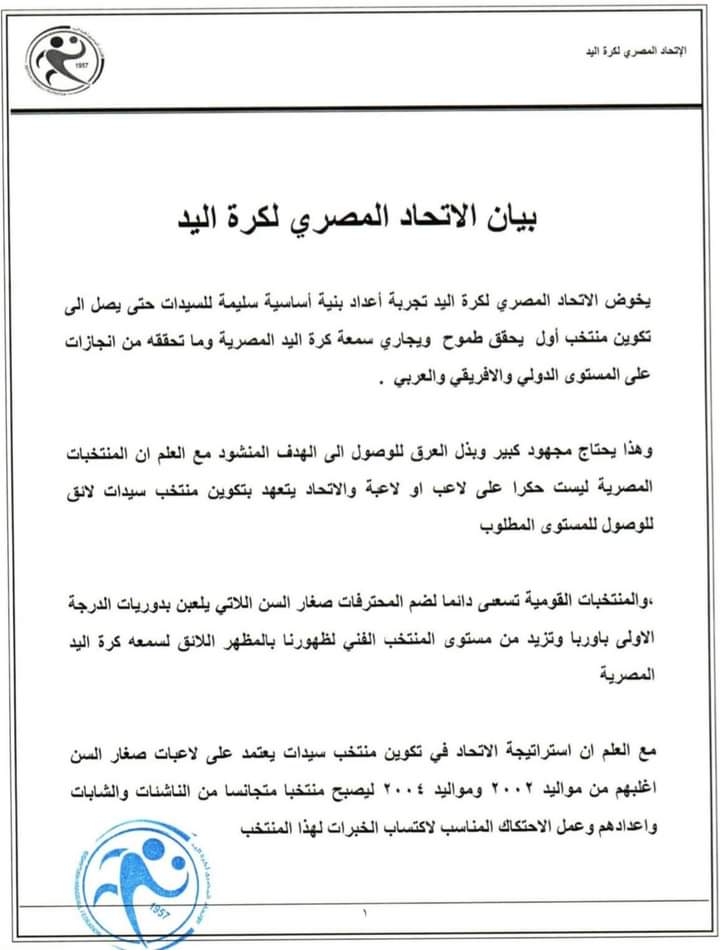 أصدر مسئولو اتحاد كرة اليد برئاسة محمد الأمين، بيانا رسميا للرد على ما أثير خلال الفترة الأخيرة حول موقف اللاعبات المحترفات من الانضمام لمعسكر منتخب السيدات.
