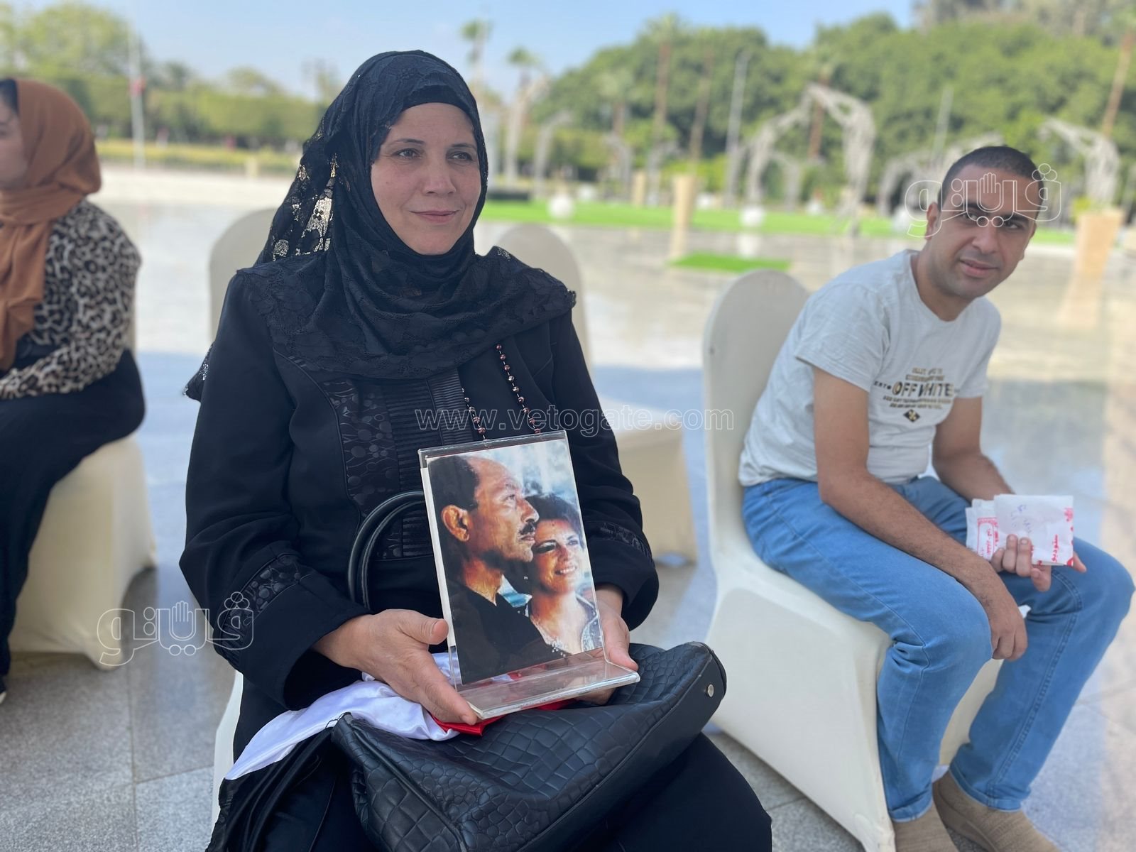 وحرص المواطنون على قراءة سورة الفاتحة على روح السادات، رافعين صورته هو وزوجته الراحلة.