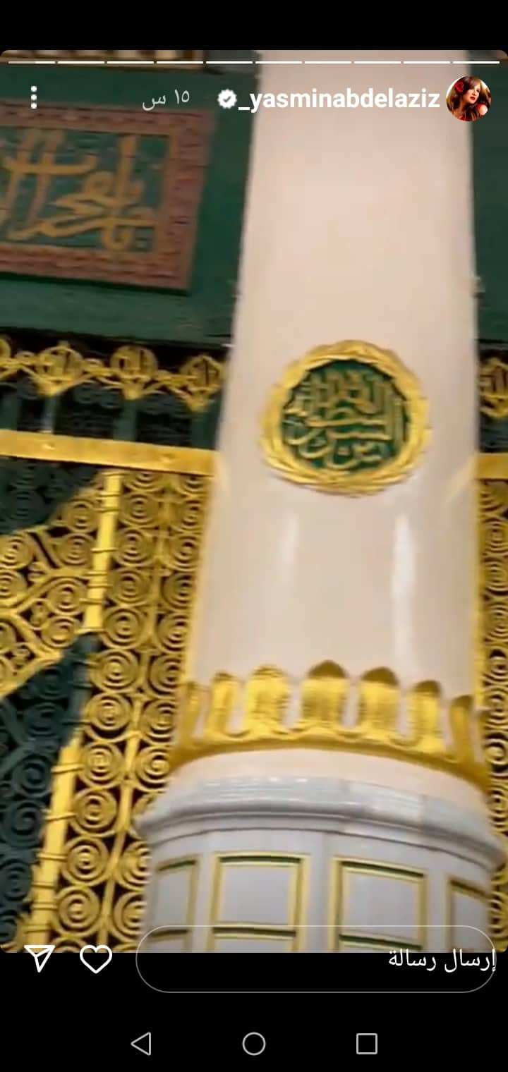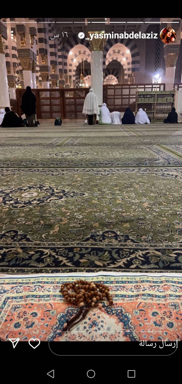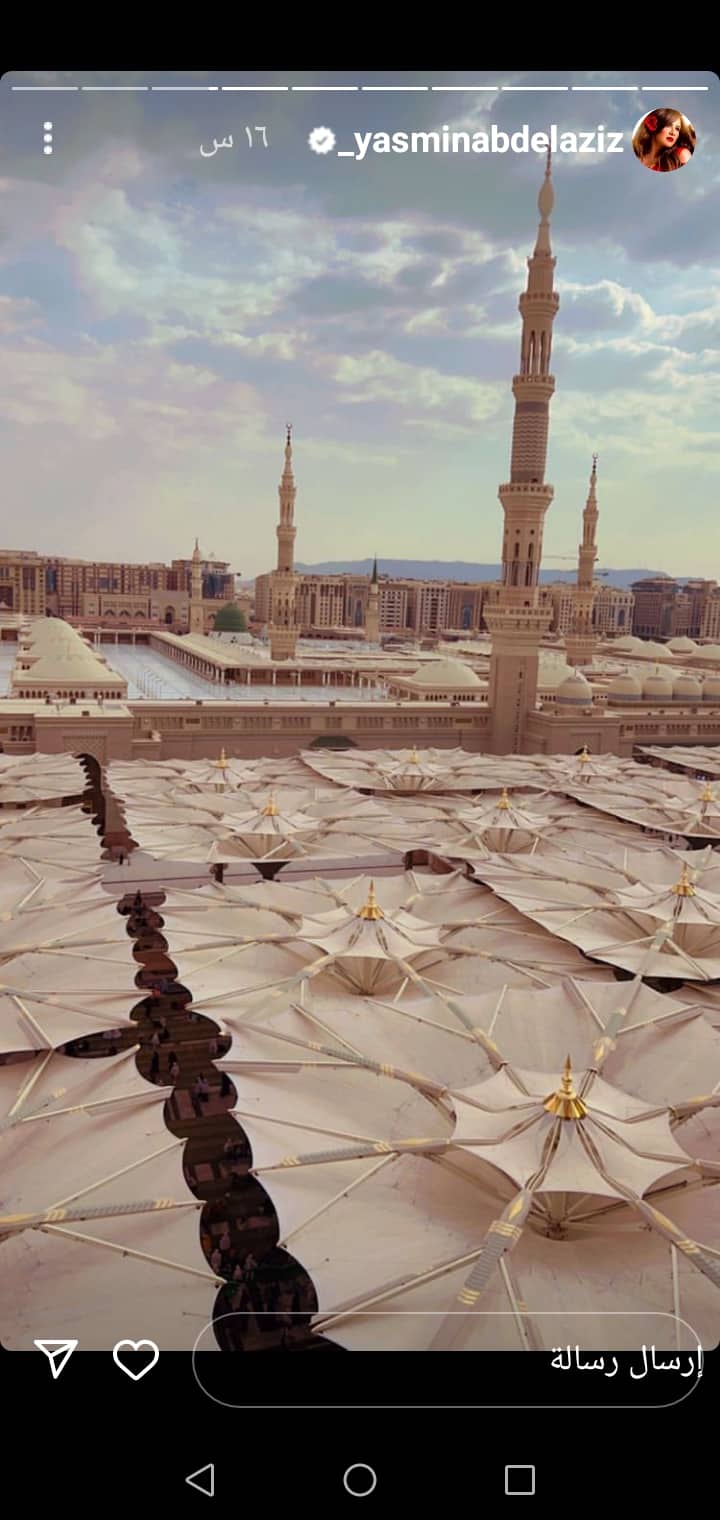 وظهرت وهى داخل المسجد النبوى الشريف فى المدينة المنورة فى السعودية، وحرصت ياسمين على التقاط الصور وهى تتجول داخل المسجد، وقامت بزيارة خاصة لـ مقبرة شهدا غزوة أحد، كما نشرت صورا للمسجد من غرفتها المطلة على الحرم المكي.