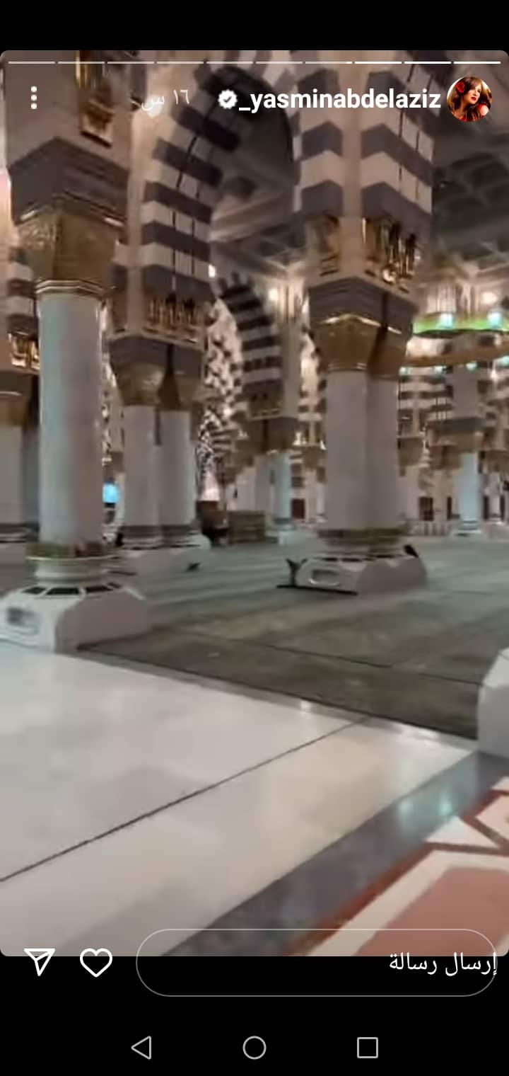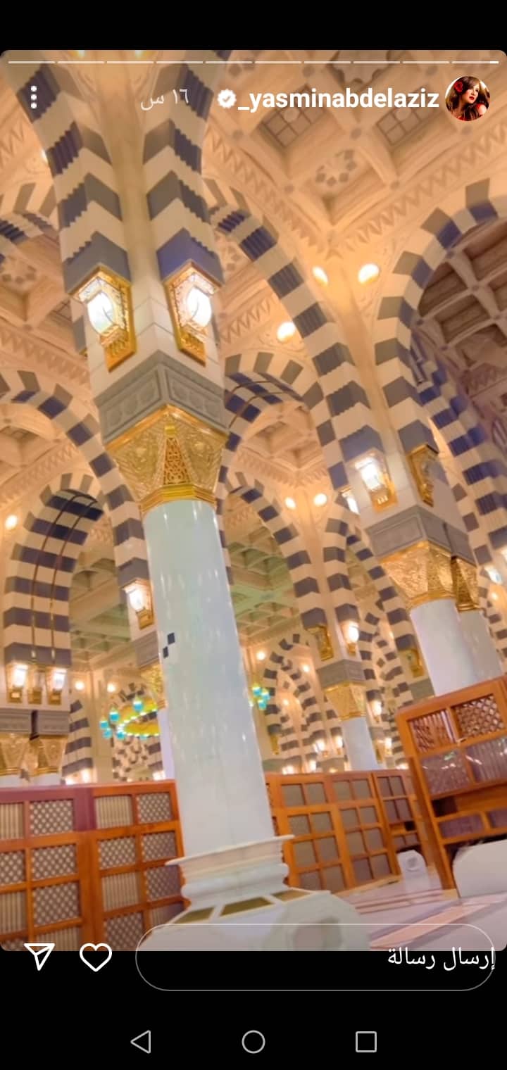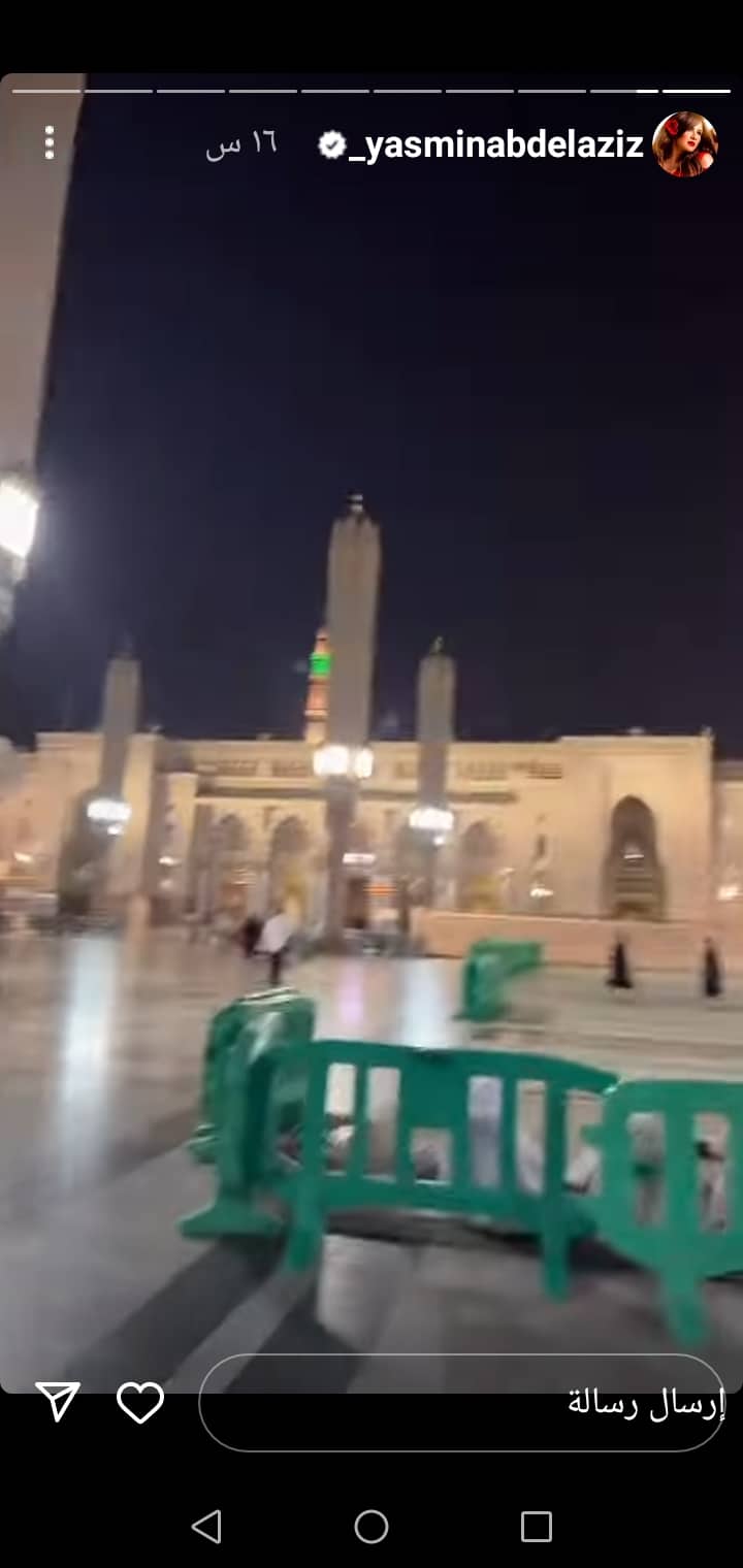 وظهرت وهى داخل المسجد النبوى الشريف فى المدينة المنورة فى السعودية، وحرصت ياسمين على التقاط الصور وهى تتجول داخل المسجد، وقامت بزيارة خاصة لـ مقبرة شهدا غزوة أحد، كما نشرت صورا للمسجد من غرفتها المطلة على الحرم المكي.